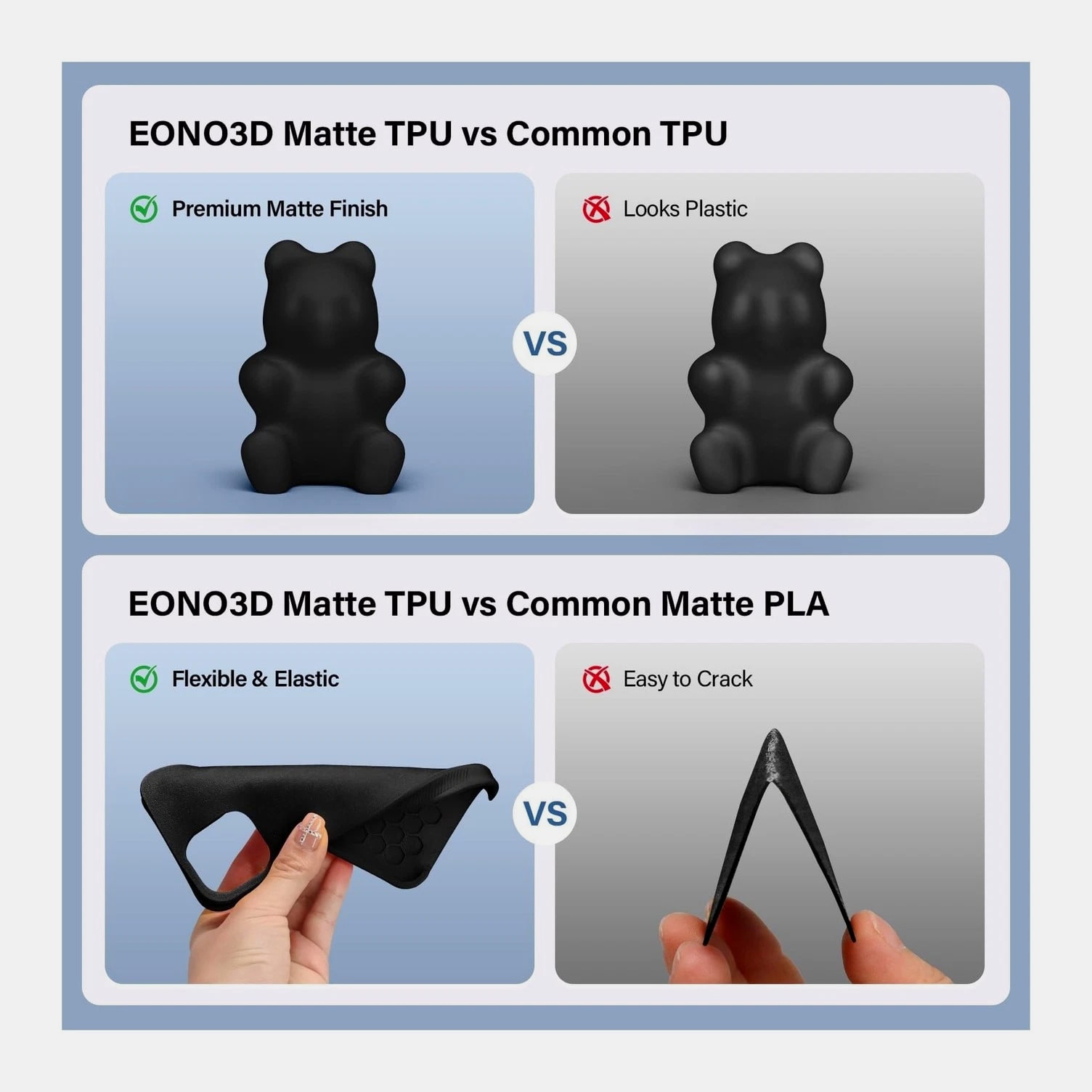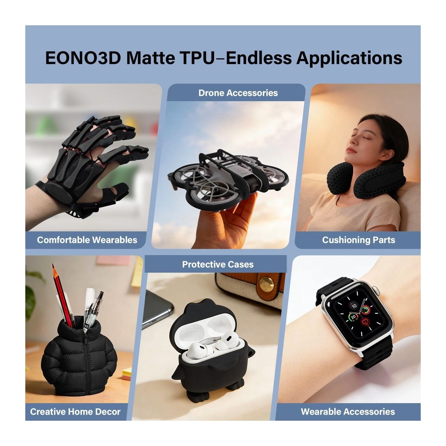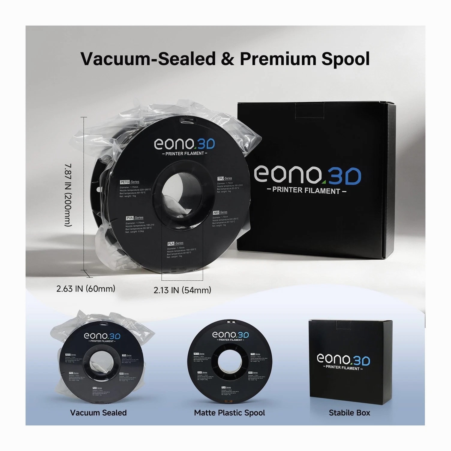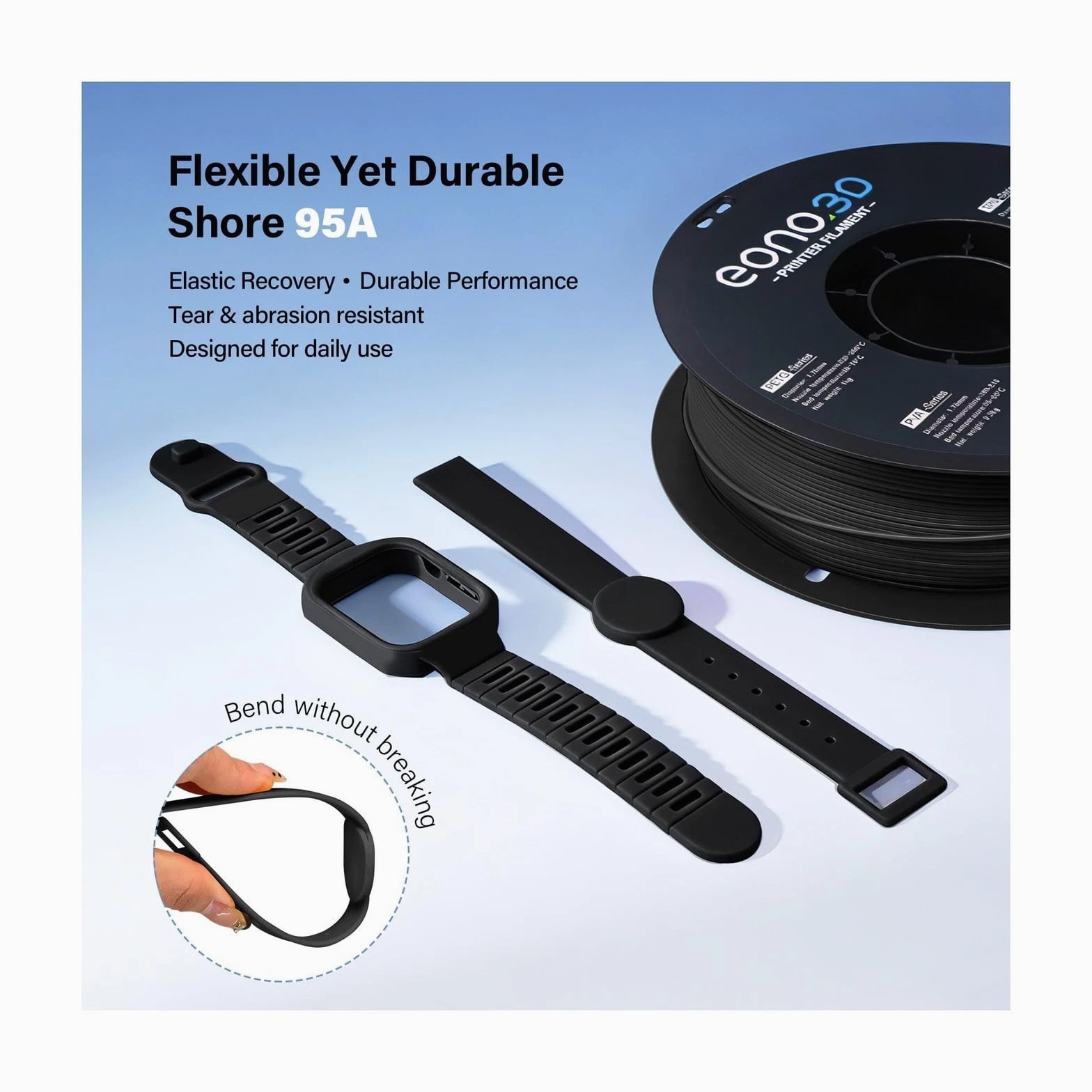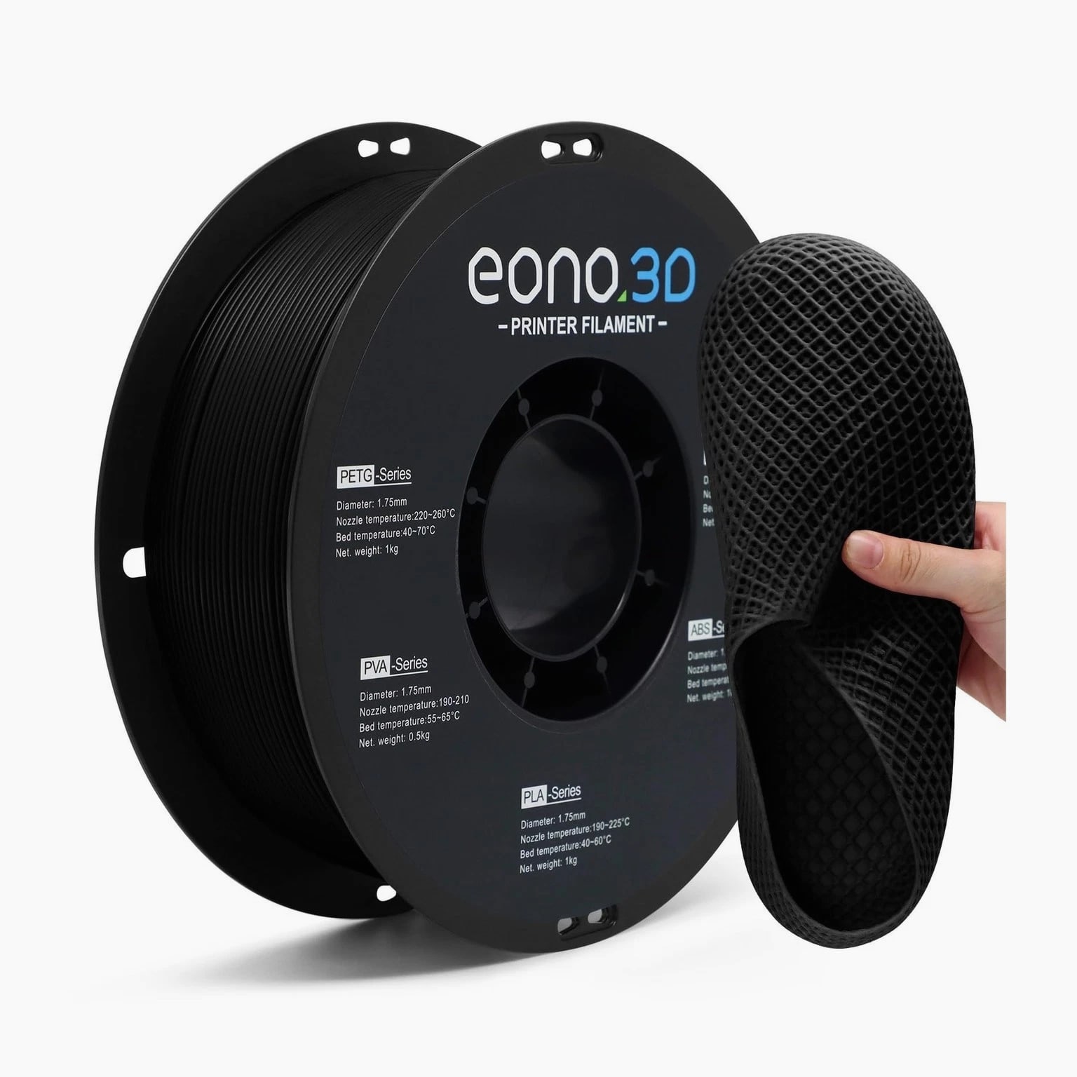 Matte TPU Filament 1.75mm, 1kg - Shore 95A Flexible & Durable TPU, Matte Black, Low-Gloss Matte Finish, Minimal Layer Lines, for Phone Cases, Wearables & Functional Parts Description Features: Premium Matte Finish Clean, Professional Look - EONO3D Matte TPU features a low-gloss, non-shiny surface that reduces reflections and hides layer lines. Perfect for prints requiring a subtle, modern, and professional appearance, such as phone cases, wearables, and fashion-related accessories. Shore 95A Flexible & Tear-Resistant - With a Shore hardness of 95A, this TPU offers the ideal balance of flexibility and durability. It bends easily while remaining tear-resistant and abrasion-resistant, making it suitable for parts exposed to frequent movement or daily wear. Minimal Layer Lines & Faster Printing - Optimized material formulation ensures excellent layer adhesion and smooth extrusion, resulting in clean surfaces with minimal visible layer lines. Supports faster print speeds compared to standard TPU without sacrificing print quality. Easy to Print Smooth Flow, Low Stringing - Designed for hassle-free TPU printing, EONO3D Matte TPU delivers stable feeding, smooth flow, and minimal stringing. Compatible with most FDM 3D printers (direct drive and well-tuned Bowden systems), with low warping and no heated chamber required. Functional, Durable & Ready to Use - Ideal for phone cases, straps, shoe soles, flexible enclosures, cushioning parts, and mechanical components. Each spool features a rigid matte plastic reel that resists deformation, ensuring stable feeding and smooth unwinding during printing. Backed by professional EONO3D customer support for reliable use. Product Details: Brand: EONO3D Material: TPU Color: 1-matte Black TPU-1kg Item Weight: 1.2 Kilograms Item Diameter: 6 Centimeters Brand Name: EONO3D Additional Features: 95A Flexibility for Durability and Functionality Manufacturer Part Number: EONO3D-Matte TPU-Black-1KG Manufacturer: EONO3D Number of Items: 1 Material Type: TPU Color