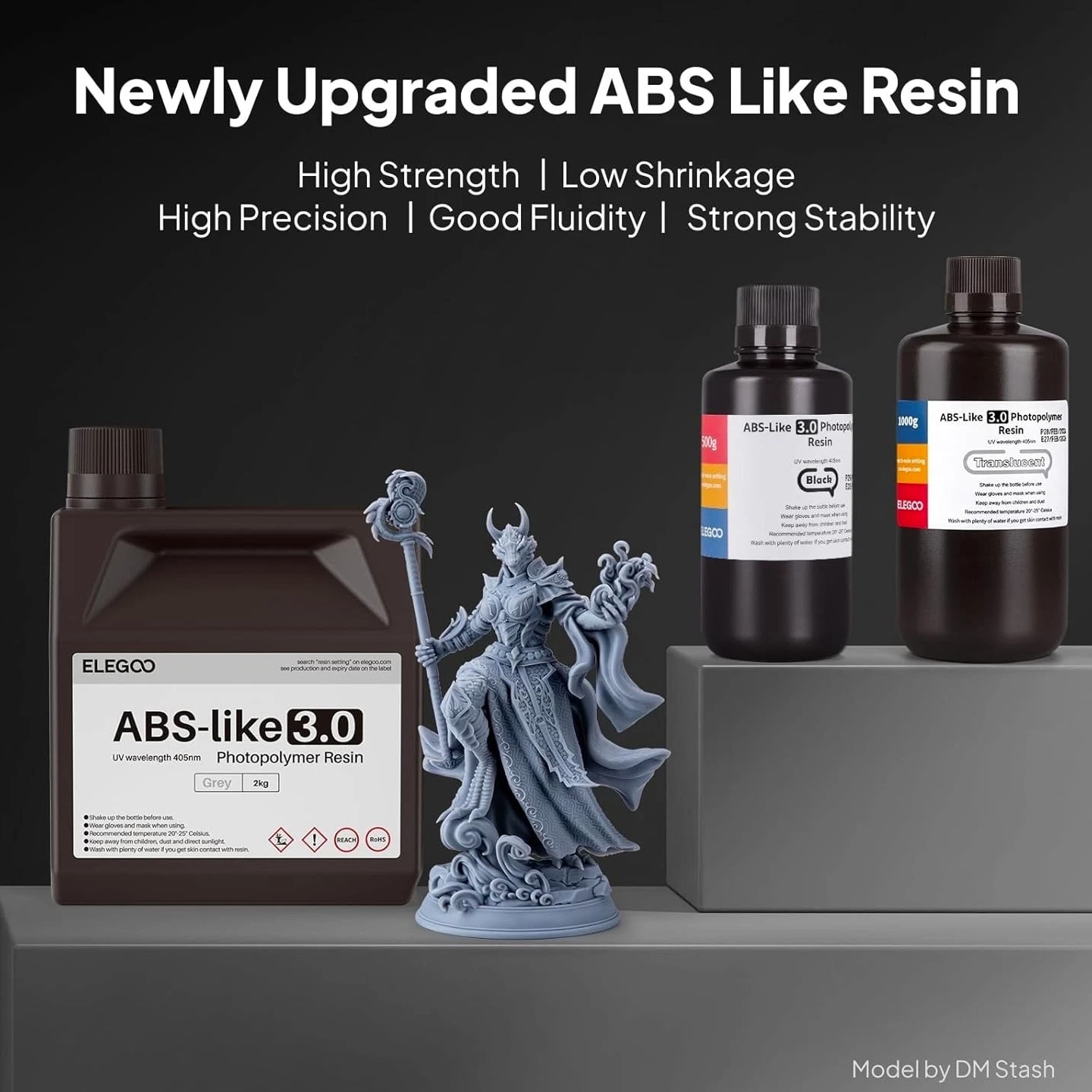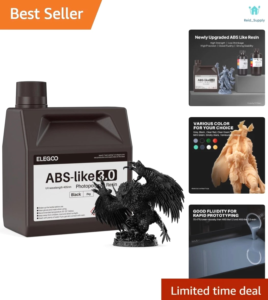 ELEGOO ABS-Like 3D Printer Resin 3.0 Unlock your creativity with our ABS-like 3D printer resin, specifically formulated to deliver exceptional strength, precision, and versatility for all your 3D printing needs. Key Features: High Strength and Toughness: Engineered for high impact resistance, this resin can withstand drilling and impacts without losing structural integrity, making it ideal for functional prototypes and mechanical parts. High Precision & Low Shrinkage: Developed with lower volume shrinkage to ensure intricately detailed prints and smooth surfaces, achieving accurate dimensions with minimal distortion. Good Fluidity for Rapid Prototyping: With a viscosity 25-47% lower than traditional ABS-like resins, it flows easily and peels smoothly, enhancing print success and reducing time. Strong Stability: Formulated to maintain excellent stability, this resin does not delaminate over time, ensuring consistent color and quality across printed models. Wide Compatibility: Compatible with a broad range of LCD/DLP 3D printers that use 405nm UV light-curing technology, optimized for ELEGOO light-curing printers. Why Choose ELEGOO ABS-Like Resins? Are you seeking reliability and performance in your 3D printing projects? Our ABS-like 3D Printer Resin 3.0 is your ideal choice. With its unparalleled resilience and precision, you will achieve remarkable results for everything from complex prototypes to robust industrial components. Whether you're a seasoned professional or a passionate hobbyist, trust in the high quality and superior functionality of our resin to elevate your 3D printing experience. Experience the difference today – invest in ELEGOO ABS-Like 3D Printer Resin 3.0 for your next project and unlock limitless possibilities!