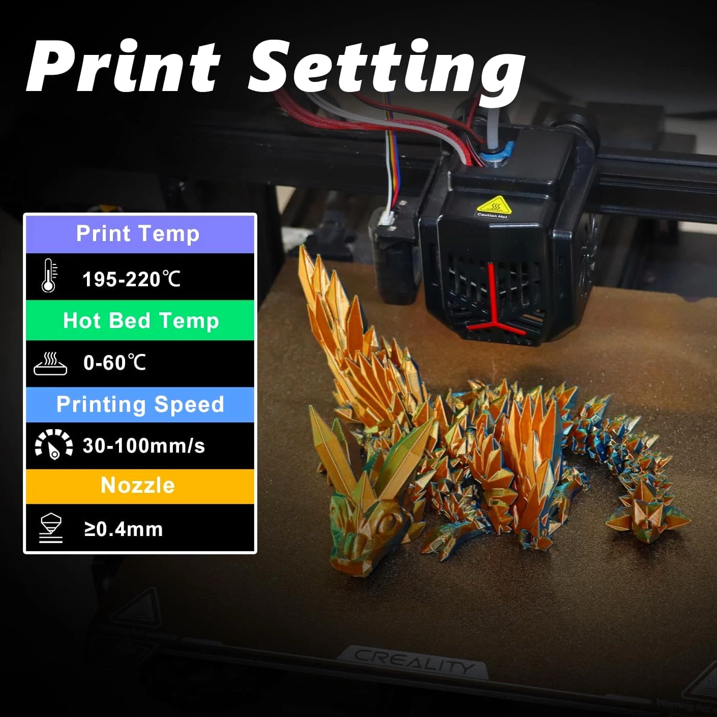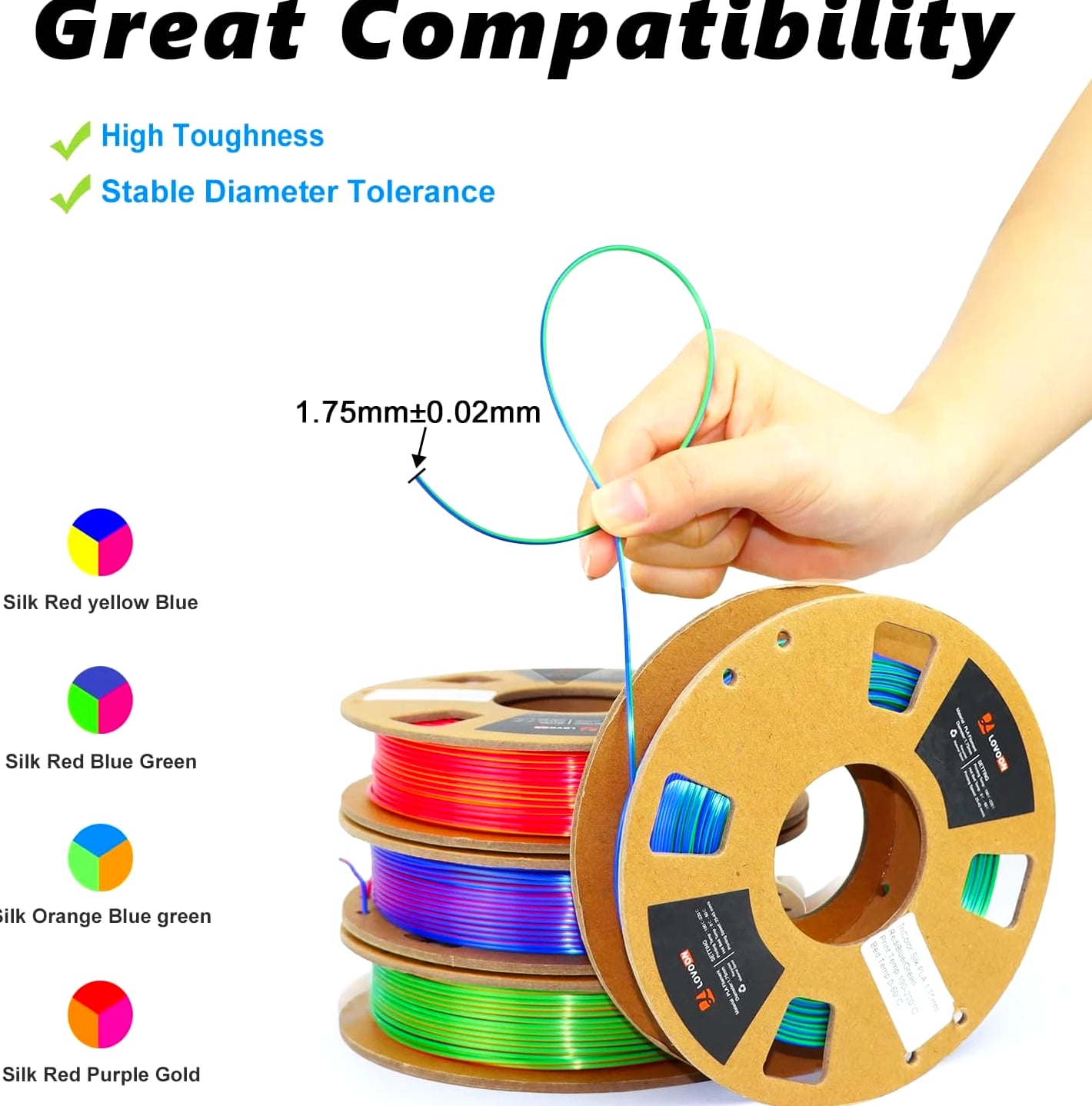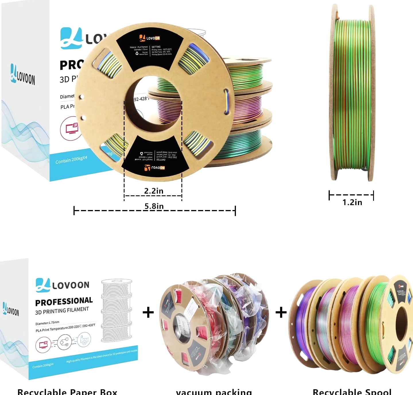 3D PLA Filament 1.75mm Bundle, Tri-Color 3D Printer Filament Bundle, Rainbow Silk PLA Filament, PLA Filament for 3D Printer and 3D Pen, Dimensional Accuracy +/-0.02mm, 200G X 4 Spools Description Material Polylactic Acid Color Tri-Color Bundle Item Diameter 1.75 Millimeters Item Weight 2.2 Pounds Size 200g x 4 spool Tri-Colors Filament Bundle: This magical 3D filament bundle features three distinct colors (Red-Blue-Yellow) (Red-Blue-Green) (Orange-Blue-Green) (Red-Purple-Gold)- ensuring every print job will boast vibrant rainbow colors, no matter how small the project. Let your imagination run wild and enjoy the creativity and possibilities 3D printing offers. Silk Shiny Glossy Surface: LOVOON PLA filament features a beautiful silky appearance, being both glossy and smooth. The fast color changing feature enables you to produce smooth, multi-colored, even intricate 3D-printed items with ease, making it perfect for 3D design, craft, and modeling projects. Easy to Print: For better printing smoothness and success, please use 0.4 mm nozzle or larger, printing speed lower than 150mm/s. Recommended print temperature: 190-230°C. Bed temperature: 60°C. Printing speed: 30-200mm/s. Universal Compatibility: The tolerance of the diameter of this 1.75mm PLA filament is +/- 0.02mm. Giving you smoother 3D printing without any jamming, bubbling, tangling, or layering. Most FDM 3D printers and 3D pens in the market are compatible with our 3D print filament. Moisture-Proof Package: Completely dried for 24 hours before packaging and then vacuum sealed with desiccants to effectively protect the filament from moisture. LOVOON filaments come in gift packaging which is suitable for giving as a preferred gift to children and friends. LOVOON Support- LOVOON pays great attention to your usage experience and suggestions. If you meet any problems, we are here to provide you with the best solution. Product description 1 Green Red Blue 2 Yellow Red Blue 3 Orange Green Blue 4 Gold Red Purp