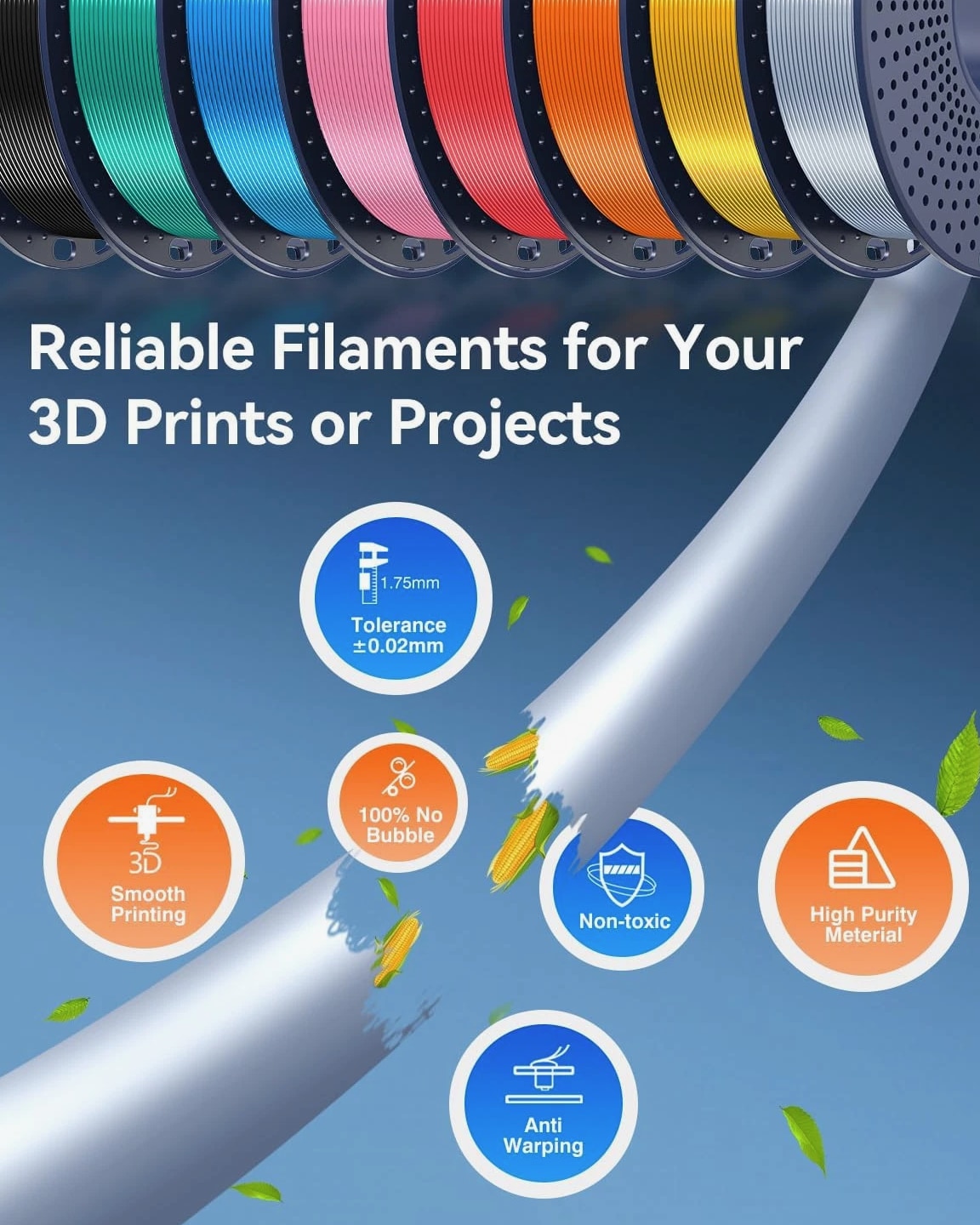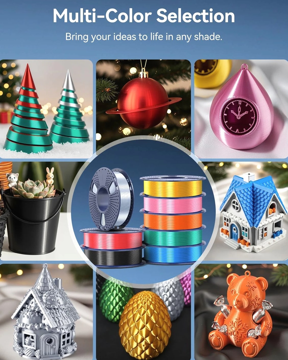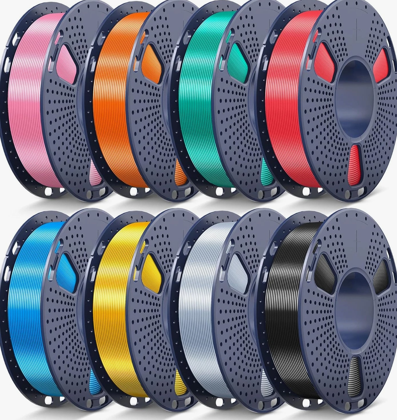 Silk PLA Filament Bundle 1.75mm, Silk 3D Printer Filament Bundle Multicolor, Individually Vacuum Packed, 8 Pack, Shiny Silk 2KG in Total, Light Gold+Silver+Black+Blue+Red+Green+Orange+Pink Description Material Polylactic Acid Color Silk Light Gold+silver+black+blue+red+green+orange+pink Item Diameter 1.75 Millimeters Item Weight 2 Kilograms Size 2KG 【Silk Filament Bundle Multicolor】Silk PLA 3D printer filament bundle multicolor, 8 colors in total: Light Gold+Silver+Black+Blue+Red+Green+Orange+Pink. 8 rolls of multicolor 250g PLA SILK Filament, individually vacuum packed, 2KG total. 【Silk 3D Filament 1.75mm】3D Printer Silk filament has a glossy color. Giving a silky texture, touch, and color to any 3D models. Glossy Silk PLA Filament can print 3D printing objects with smooth silk features. 【Neatly Wound Filament】3D printer filament is neatly lined up, which can avoid filament tangling during the printing process, reducing the risk of clogging and greatly increasing the printing success. 【1.75mm Filament Diameter】PLA Silk 3D printer filament has 1.75 mm diameter, dimensional accuracy +/- 0.02 mm, accurate diameter making it suitable for almost all FDM 3D printers. 【High Compatibility & Easy to Use】Compatible with 99% of FDM 3D printers and 3D pens on the market. Silk PLA filament's excellent stability is friendly to both beginners and advanced users. 【Recommend Settings】We recommend printing the Silk filament at nozzle temperature of 205-215°C, bed temperature of 50-60°C, and printing speed of 40-60mm/s. We offer competitive prices on high quality products. Our store includes media such as books, movies, music and games while offering electronics, toys, sporting apparel, clothing, tools, general home, garden items and more. We are always working hard to ensure your package arrives as soon as possible. Please understand that some factors like weather, high postal traffic, and the performance of shipping companies are outside of our control