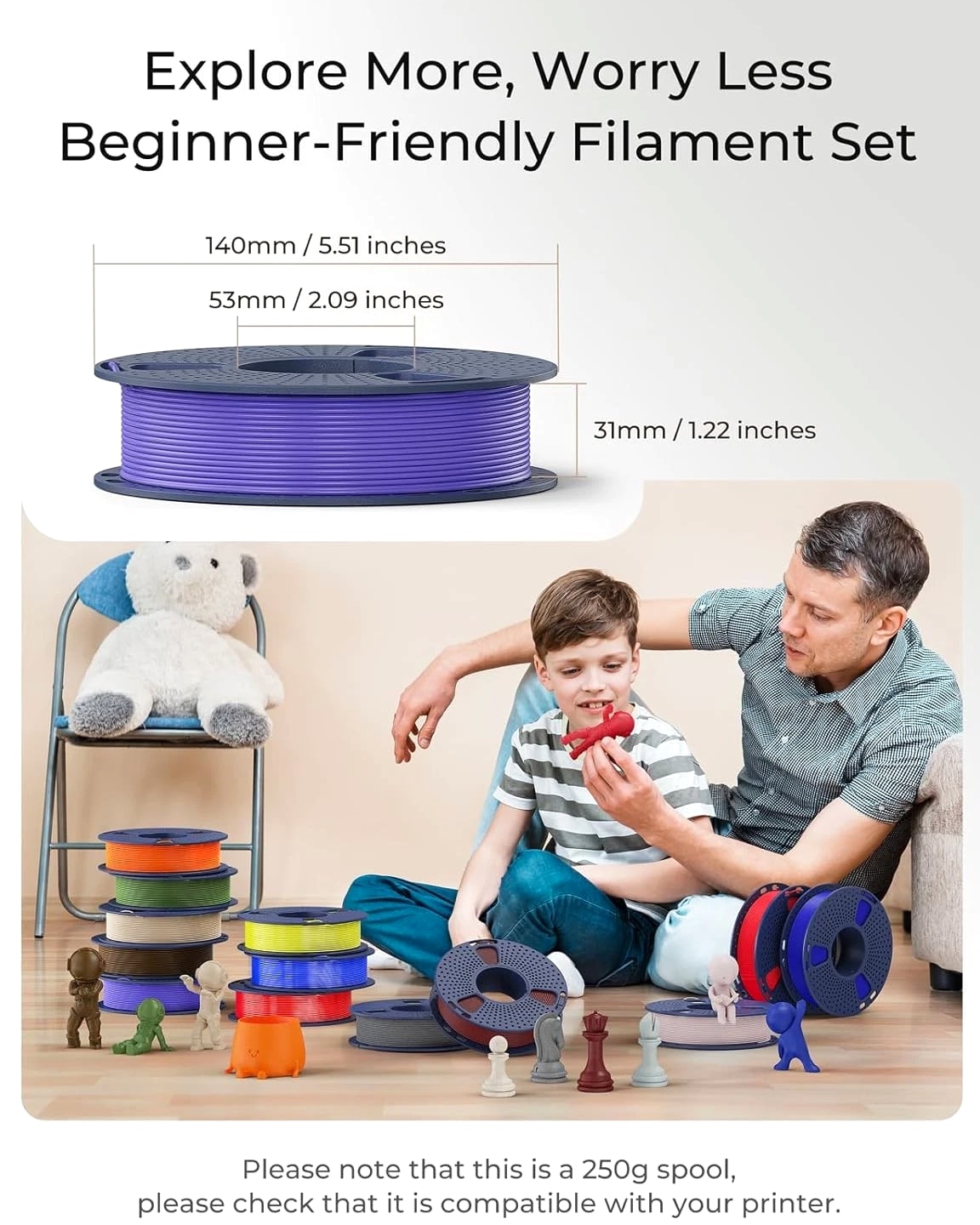 About this item 【Beginner-Friendly Small Spool Filament Pack】Perfect for 3D printing beginners! This 250g × 8-color PLA filament bundle uses compact 250g mini spools, ideal for testing multiple colors without committing to full 1kg rolls. Please carefully check spool size before purchasing: each spool measures approximately 140mm in outer diameter, 36mm in width, and has a 53mm center hub hole. These mini spools are compatible with most open-frame and top-load printers but may not fit printers that require large 1kg spools or enclosed spool bays. Compact, lightweight, and easy to swap—perfect for experimentation and color exploration. 【High-Quality PLA Material】: Made from premium PLA, this filament offers low melting temperature, minimal warping and shrinkage, and a smooth, glossy surface finish. It is odorless during printing and safe for indoor use. For best results, please check the spool condition after opening the bag, and keep hold of the filament end when loading to avoid sudden tension release that may cause loose coils. 【Smooth Surface Finish】: Excellent layer adhesion and accurate material deposition result in clean, smooth prints with reduced risk of layer separation. The lower printing temperature also simplifies the process while ensuring consistent print quality. 【Important Notice】Please read the user manual carefully before use. Successful printing depends on proper temperature and adequate cooling. Before printing, check that the filament is loaded neatly and that the loose end is secured during handling. When encountering clogging issues, first verify the printer model and parameter settings, then confirm whether the printing temperature/speed meets specifications (recommended: nozzle 235°C, bed 80°C, speed 40mm/s), and ensure the material is dry. 【Easy to Use】: This filament is beginner-friendly and performs well across various temperature and speed settings. Improved fluidity and toughness allow for stable, reliable prints with less effort