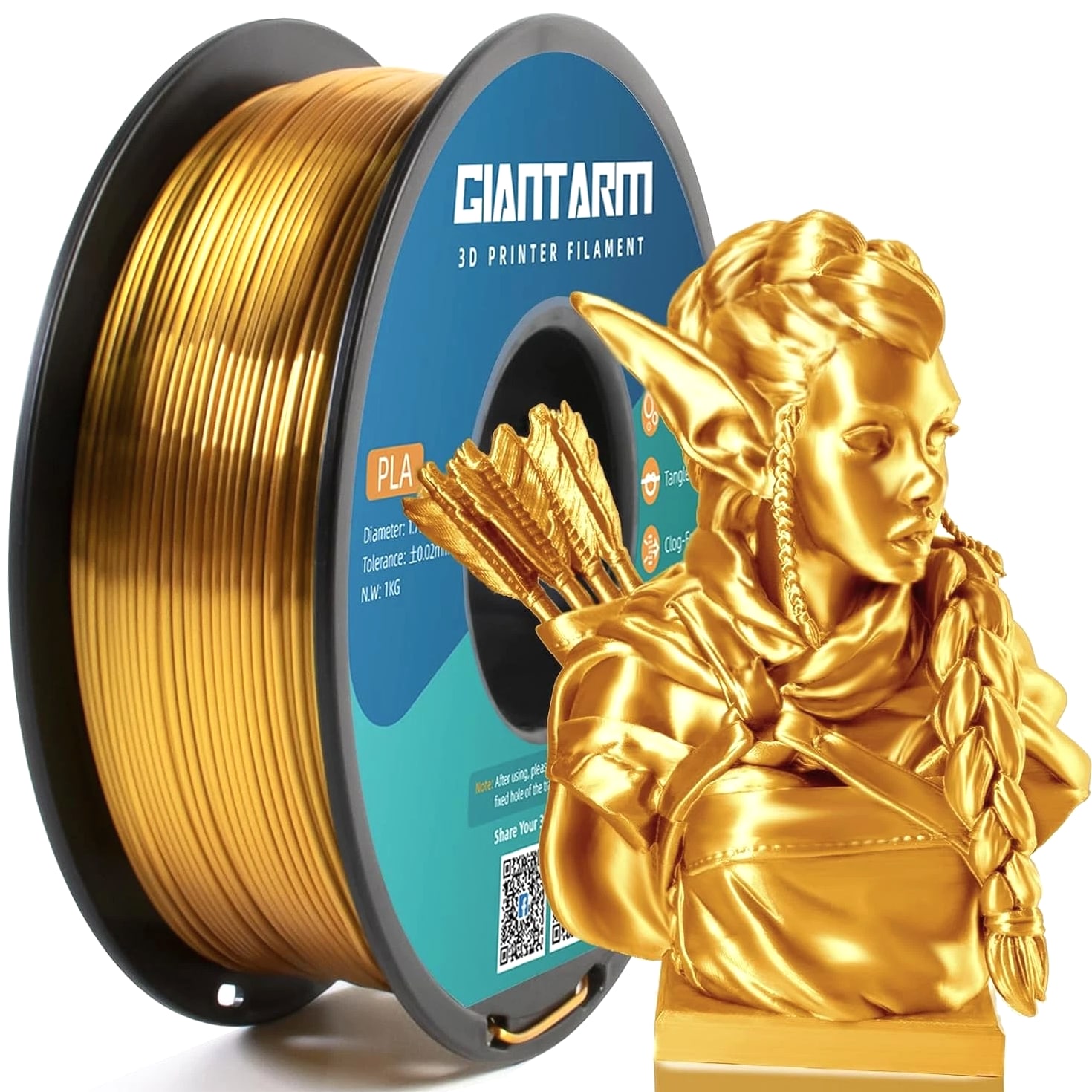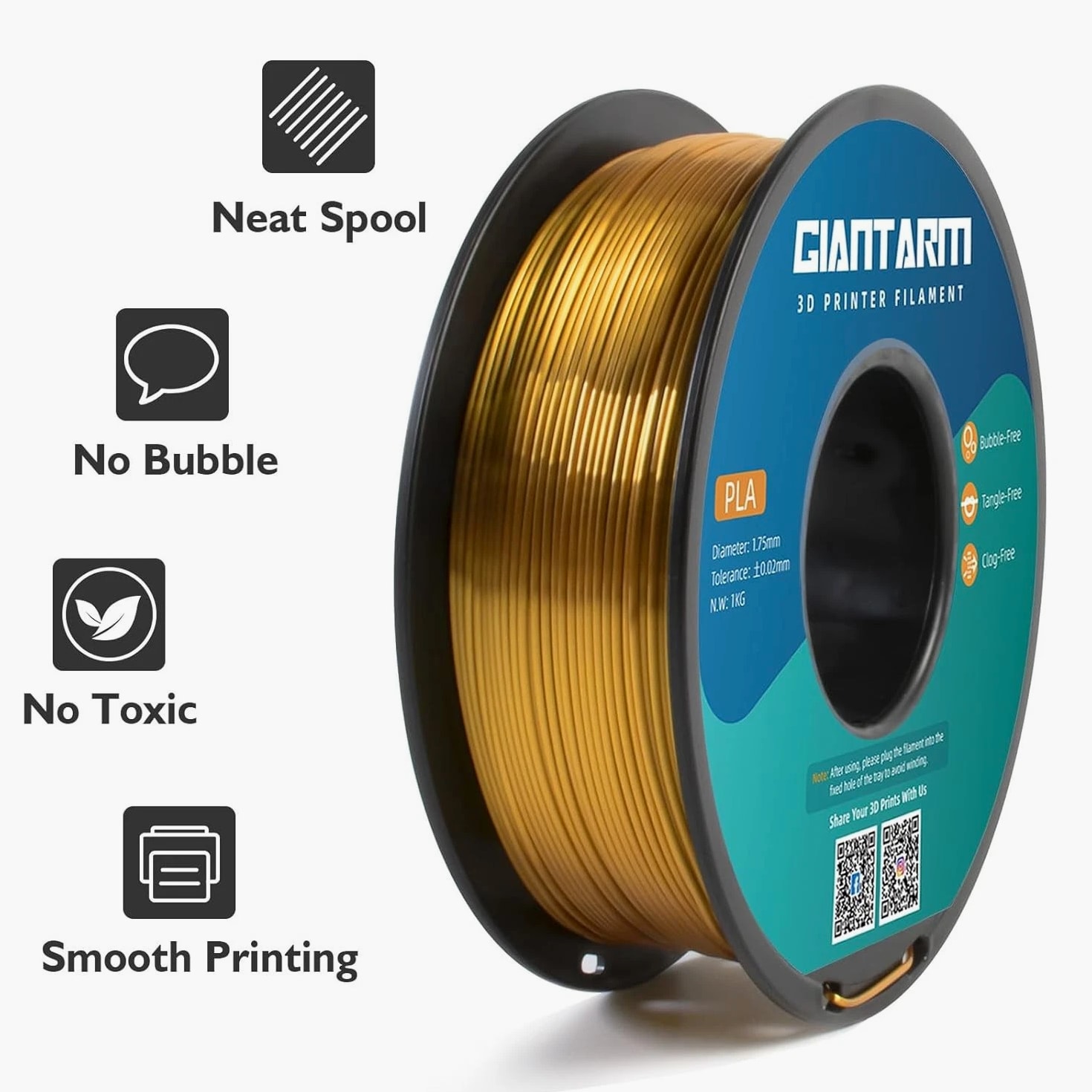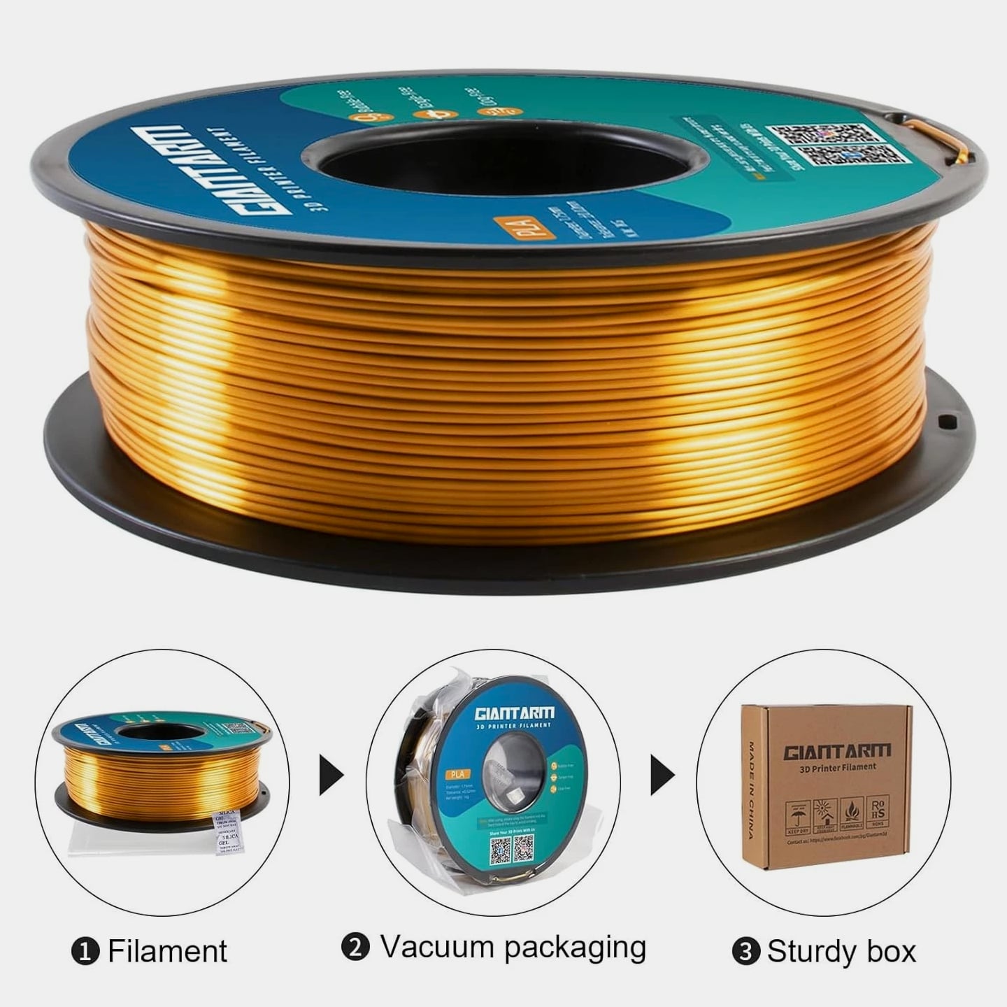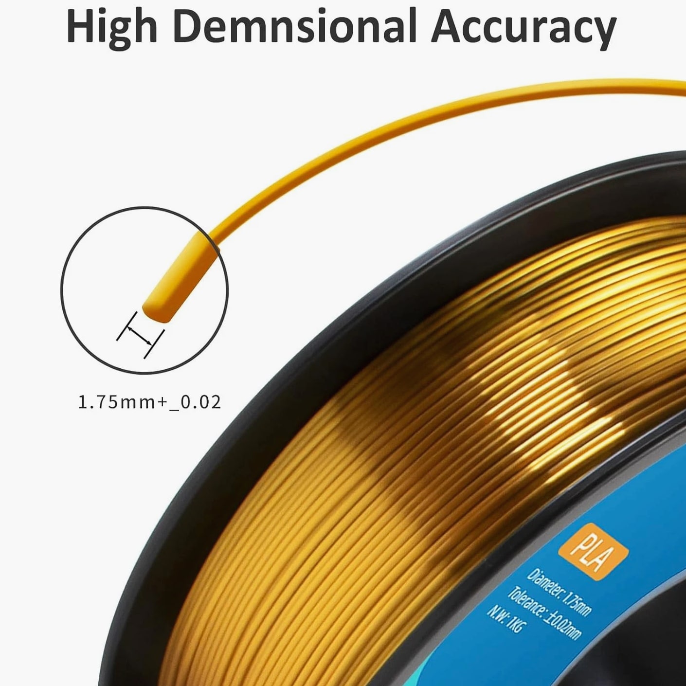 About this item 【Shiny Silk PLA】 Smooth and shiny finish like real silk, no extra polishing needed, printing at high detail results in a beautiful finish. Works perfectly with most FDM 3D Printers and 3D Printer Pen on the market. 【1.75mm Diameter, dimensional accuracy +/- 0.03 mm without any exaggeration, 1 kg spool (2.2lbs), consistent colors without traces of other pigments. 【Clog-Free, Bubble-Free & Easy-to-use】---Complete drying for 24 hours before packaging and vacuum sealed with desiccants in nylon bag, enable much smoother and more stable printing. Recommended PLA Filament Extrusion/Nozzle Temperature 190℃ -215℃, bed 40℃-60℃. 【Professional Packaging】--Vacuum packaging with desiccant to keep the 3D Printer filament dry and keep out dust and foreign particles. Weight: 1KG (2.2Ibs) Spool, Width: 2.5", Spool Diameter: 7.8", Spool Hub Hole Diameter: 2.30". please remember to return it to the re-sealable bag promptly after use to maintain excellent condition. Material: Polylactic Acid Color: Silk Gold Pla Item Weight: 1 Kilograms Item Diameter: 1.75 Millimeters