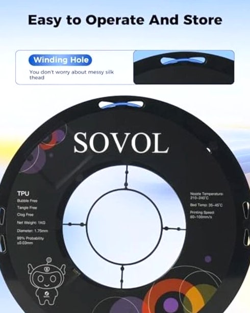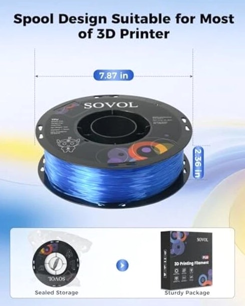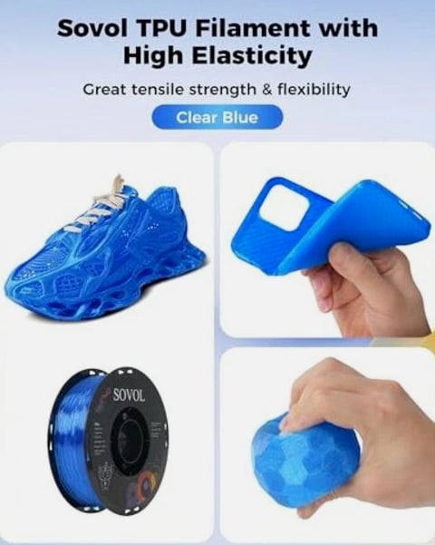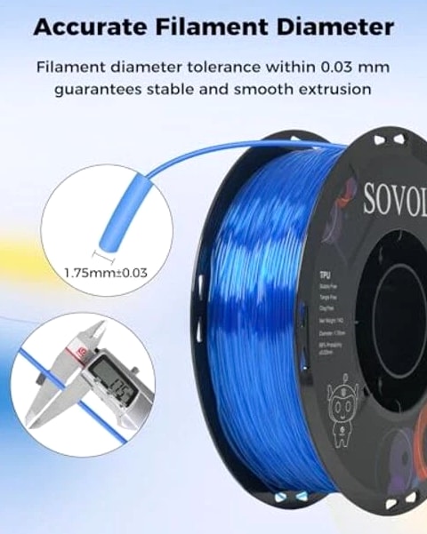 TPU Filament 1.75mm, 95A Soft TPU Flexible 3D Printer Filament with High Elasticity, 1kg (2.2lbs), Dimensional Accuracy +/- 0.03 mm, Compatible with Most FDM Printers, Clear Blue Product Description Soft & High Elasticity: TPU is highly flexible and durable. Featuring Shore hardness of 95A, TPU filament allows you to print soft yet strong prints, such as shoe insoles, watch bands, phone cases, drone parts and more. High Quality TPU Material: TPU filament is easy to print with minimal tolerance and warping, easy handling, minimal deformation, no odor, no clogging, no bubbles. Excellent Layer Adhesion: Setting the standard for impeccable layer adhesion and delivering impressive results. TPU features optimal layer bonding and flawlessly smooth extrusion for FDM 3D Printers using 1.75mm diameter filament. Vacuum Packaging: Completely dried for 24 hours before packaging and vacuum sealed for smoother and more stable printing. Please store it in a re-sealable bag after use to maintain excellent printing performance. Easy to Print: Full mechanical winding with strict manual examination ensures tidy line work, preventing possible snap and line breaking; Larger spool inner diameter design enables smoother feeding. The diameter tolerance of this 1.75 TPU filament is +/- 0.03mm. More stable diameter tolerance of 3D printer filament provides smoother 3D printing experience. Universal compatibility with most FDM 3D printers and 3D Pens. Recommended extrusion nozzle temperature: 220°C, hot bed temperature: 50°C - 70°C, printing speed: 60mm/s.