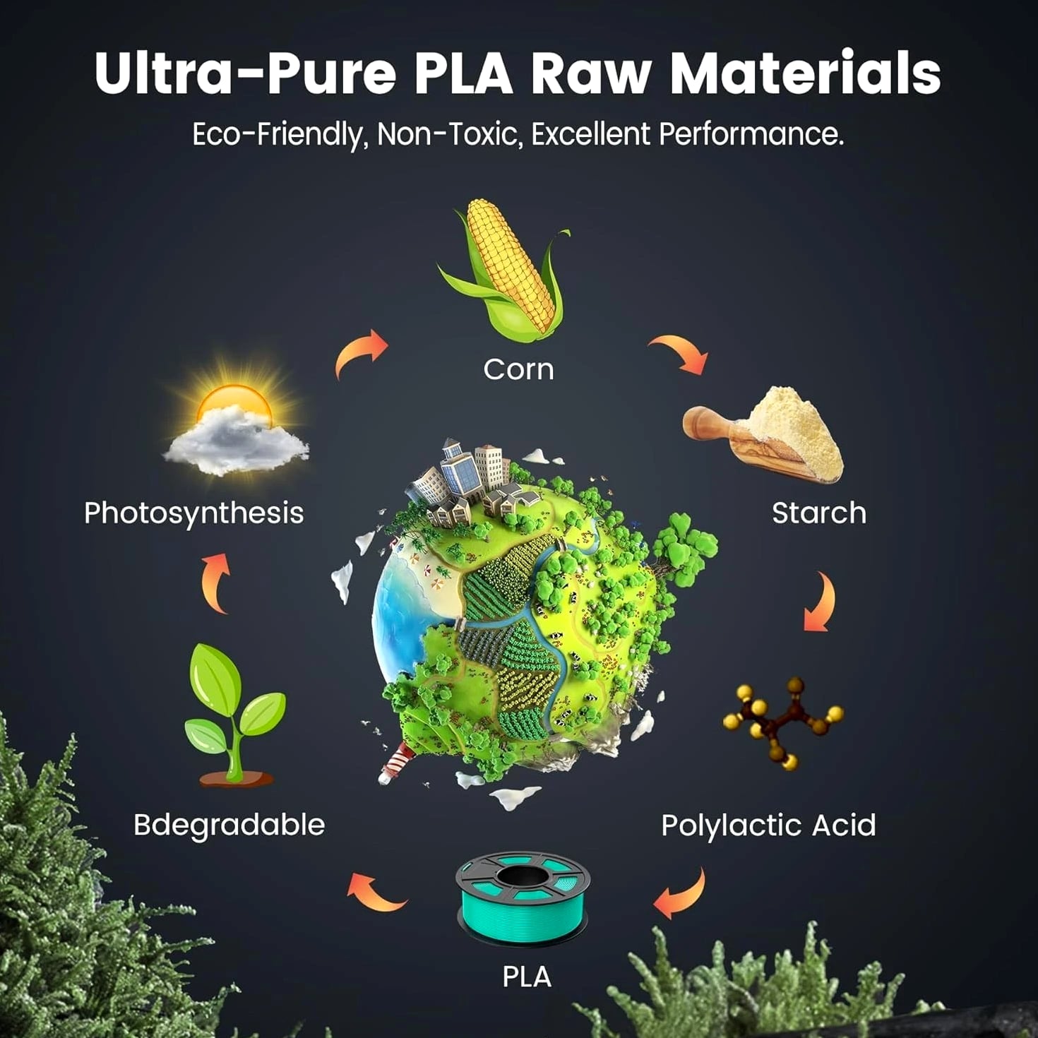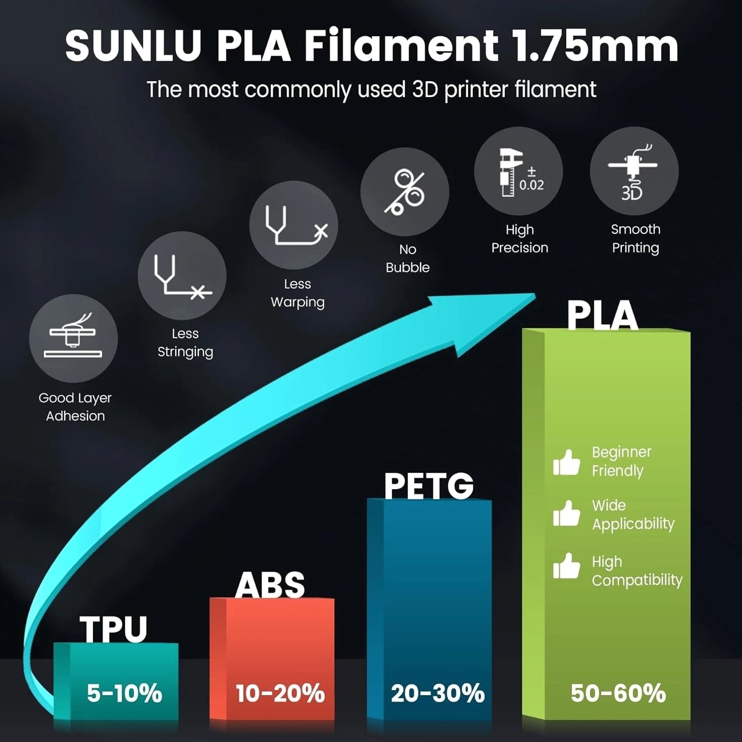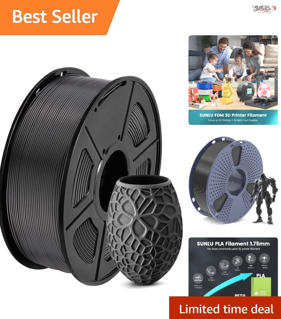 Versatile 1.75mm Black PLA Filament - Premium Printing with No Clogs or Bubbles Versatile 1.75mm Black PLA Filament Experience superior performance in 3D printing with our user-friendly PLA filament, designed to deliver unmatched reliability and versatility. Features: Reliable Material: Perfect for both 3D printing enthusiasts and beginners, ensuring no clogs, bubbles, or tangles. Superior Layer Adhesion: Guarantees high-quality prints with excellent detail and finish every time. Neatly Wound Spool: The self-developed winding technology ensures a 100% neat rate, significantly reducing the risk of tangles and jams. Dimensional Accuracy: With precision of +/- 0.02mm, it's compatible with nearly all 1.75mm FDM 3D printers. Perfect for Your Printer: Spool Diameter: 8.00", Spool Width: 2.50", Spool Hub Hole Diameter: 2.20" for easy compatibility. Recommended Settings: For optimal results, print at a nozzle temperature of 200-230°C and a bed temperature of 50-65°C with speeds of 50-100mm/s. Why Choose Our PLA Filament? Unlock your creativity with our high-quality black PLA filament, crafted to serve both novice and advanced users. Combine reliability and ease of use for your 3D projects. Never worry about clogs or jams again with our expertly wound spool, allowing for a seamless printing experience. From intricate designs to practical applications, our PLA filament is your key to achieving flawless 3D creations. Join successful 3D printing enthusiasts with our versatile PLA filament. Explore More with SANLU: Our line of 3D printing products includes filaments, dryers, printers, pens, and accessories tailored to ensure your crafting experience is nothing short of exceptional. Order your Versatile 1.75mm Black PLA Filament today and elevate your 3D printing results! Shipping Free & Fast Shipping - We offer complimentary shipping to most of the USA with a standard delivery time of 3-7 days. However, due to current circumstances, additional delivery time (up to 3 weeks) may be required for some items