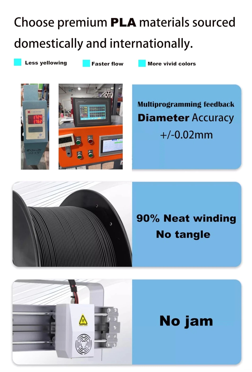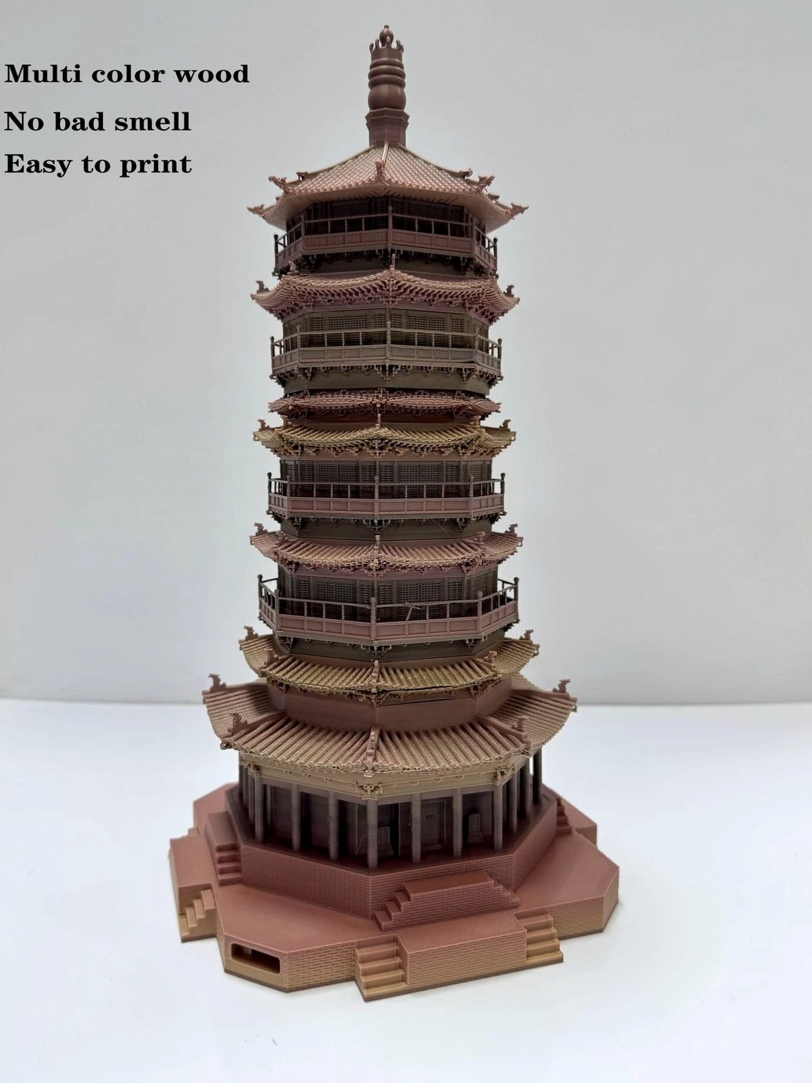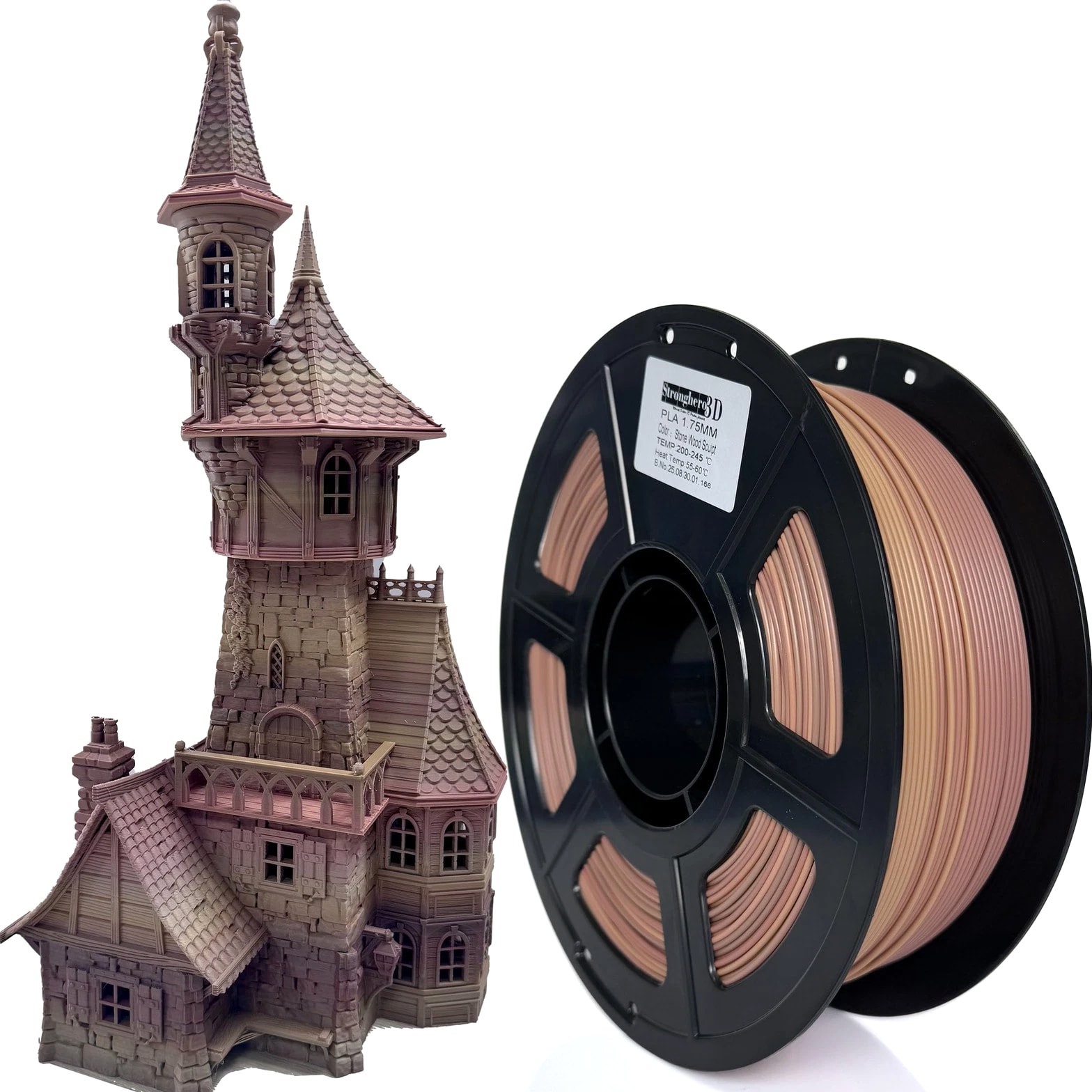 PLA 3D Printer Filament 1.75mm, Wood Stone Rock Sculpt filament, Net weight 1kg (2.2lbs) PLA 3D Printer Filament 1.75mm, Wood Stone Rock Sculpt filament, multi-color, Net weight 1kg (2.2lbs) Wood filament, multi-color wood, brown, earth yellow, much easy to print, no warp, no bad smell, good for health. No stringing, not prone to absorb moisture. Colors gradually and slowly change and transition. Good choice for miniature 3D printing. PLA filament 1.75mm, net weight 1kg, vacuum packaging and silica desiccant included. Production quality control with triple filament diameter feedback mechanism procedure reduces the filament diameter exceeding standard down to 1 in 10,000. 3D Printing Tips in Cura: recommend heat bed 50-60°C, nozzle: 195-220°C, speed 25-100mm/s, retraction length 3-5mm, retraction speed 40-50mm/s, support flow 70%, support Z top distance 0.6mm. Better flow, premium 1.75mm PLA filament, wide process temperature range, consistent diameter & roundness, less stringing and warping, strong layer adhesion. No impurities, no clogging, vacuum packaged with zipper bag, net weight 1KG per spool, 100% satisfaction warranty: within 24 hours reply. To avoid tangling, be sure to fix the filament end somewhere or in the hole of the spool after 3D printing. If you accidentally miss the filament end when injecting it into the extruder, rewind the filament out to check for tangling. Over 10 years experience in filament production, satisfaction guarantee. If you're not completely satisfied for any reason, contact us and we'll help you.