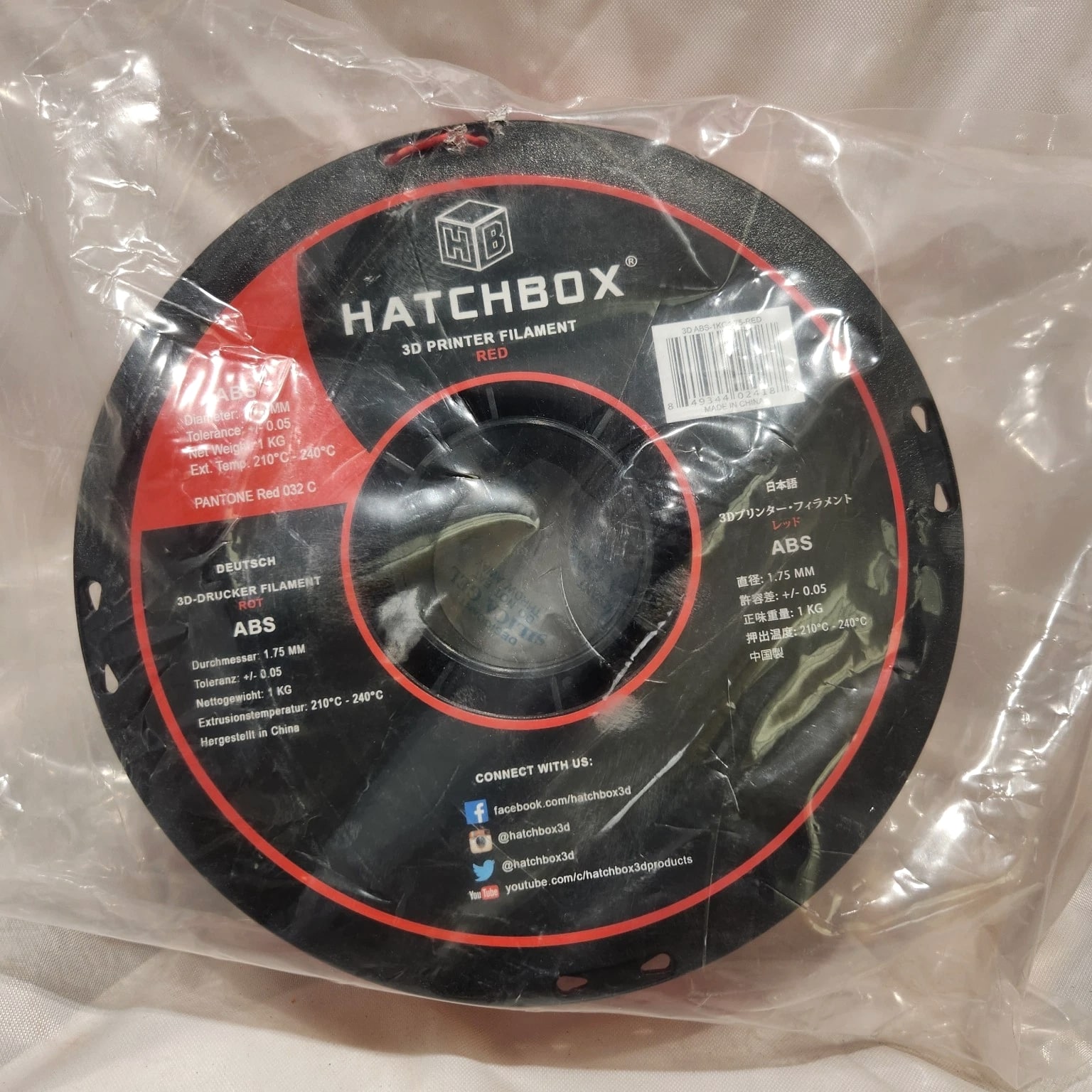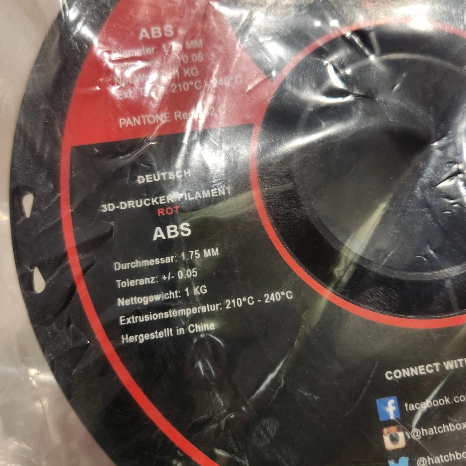 HATCHBOX ABS 1.75 mm 3D Printer Filament in Red, 1kg Spool 1 KG (approximately 2.20 lbs) Spool 1.75mm Filament Diameter (Dimensional Accuracy +/- 0.03mm) ABS (Acrylonitrile Butadiene Styrene) 3D Printer Filament Vacuumed Sealed With Desiccant Recommended Extrusion/Nozzle Temperature: 210°C - 240°C (410°F - 464°F), Use With Heated Build Platform Is Recommended Spool Diameter: 7.88" - Spool Width: 2.69" - Spool Hub Hole Diameter: 2.20"