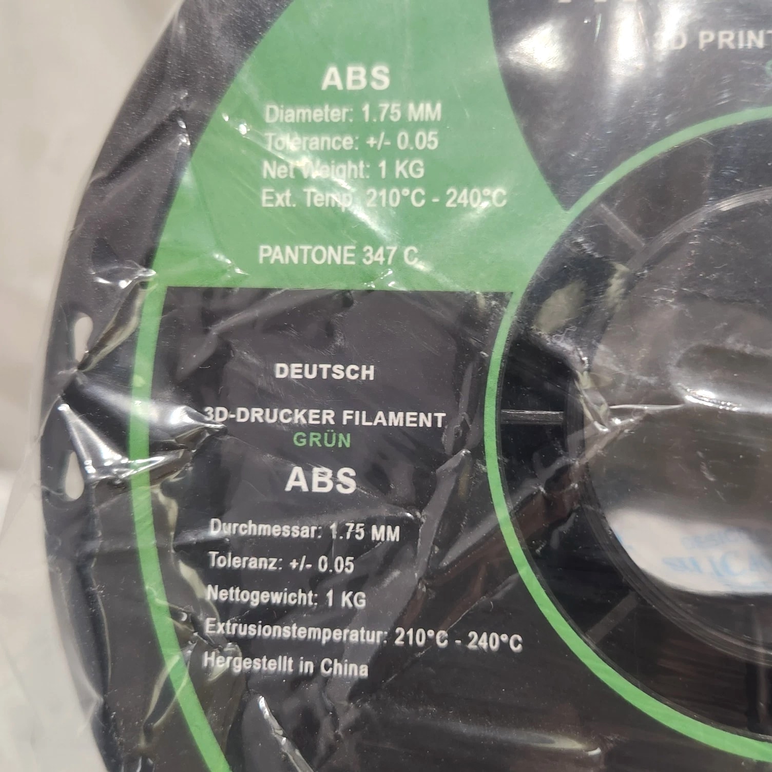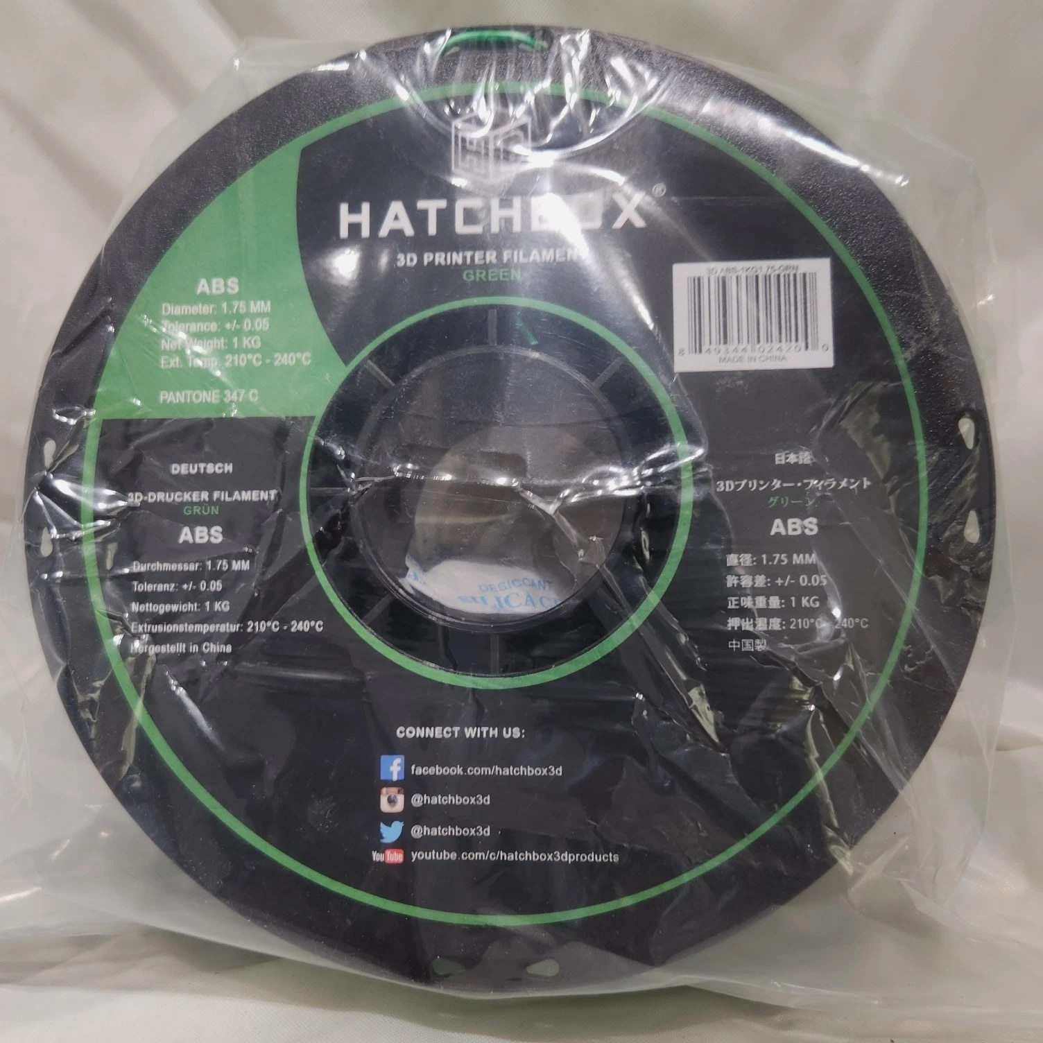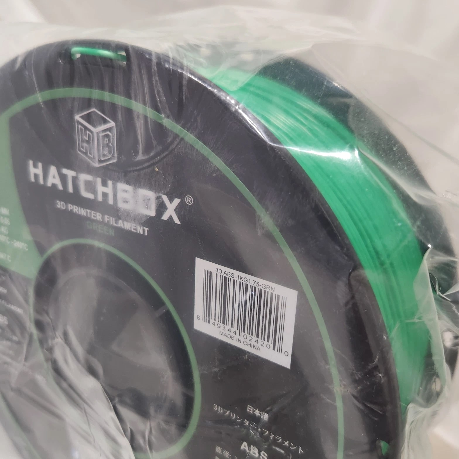 HATCHBOX ABS 1.75 mm 3D Printer Filament in Green, 1kg Spool 1 KG (approximately 2.20 lbs) Spool 1.75mm Filament Diameter (Dimensional Accuracy +/- 0.03mm) ABS (Acrylonitrile Butadiene Styrene) 3D Printer Filament - Vacuumed Sealed With Desiccant Recommended Extrusion/Nozzle Temperature: 210°C - 240°C (410°F - 464°F). Use With Heated Build Platform Is Recommended Spool Diameter: 7.88" | Spool Width: 2.69" | Spool Hub Hole Diameter: 2.20"