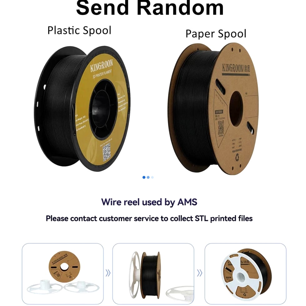 Specification *Name: 3D Printer Filament *Options: PLA/PETG/TPU/ABS (STANDARD) *Diameter: 1.75mm *Color: Black/White/Gray/Red/Blue/Green/Orange/Silver, etc. *Net Weight: 1KG *Available in PLA/PETG/TPU/ABS options; please verify your selection when placing order. *You can purchase the type you need in one location at this link. Due to shipping costs, the initial price may be higher, but bulk purchases reduce per-unit shipping costs for greater savings. Notice We have two spool types: Plastic and Paper, shipped randomly. When you receive a paper spool but need it for AMS system use, please contact customer service and provide your email address to receive STL printed files. Standard 1KG PLA PETG TPU ABS Filament 1.75mm +/- 0.03mm No Bubbles 3D Printer Plastic, Random Spool SHIPPING POLICY: We ship to your confirmed address. Ensure your address is correct prior to payment. ● Items will be shipped within 5 business days of payment receipt. ● Please note that delivery time depends on destination and other factors. RETURN POLICY: ● All items are in brand new condition. ● If unsatisfied with the item or it is defective, return within 30 days for a replacement or refund. PAYMENTS: ● We accept all payment methods. FEEDBACK: Customer satisfaction is important to us. For any order issues, please contact us. We are here to assist and resolve concerns, so please allow us the opportunity prior to leaving feedback. We are confident we can provide a satisfactory solution. CONTACT US: For inquiries, please reach out via email. We typically respond within 24 hours on weekdays.