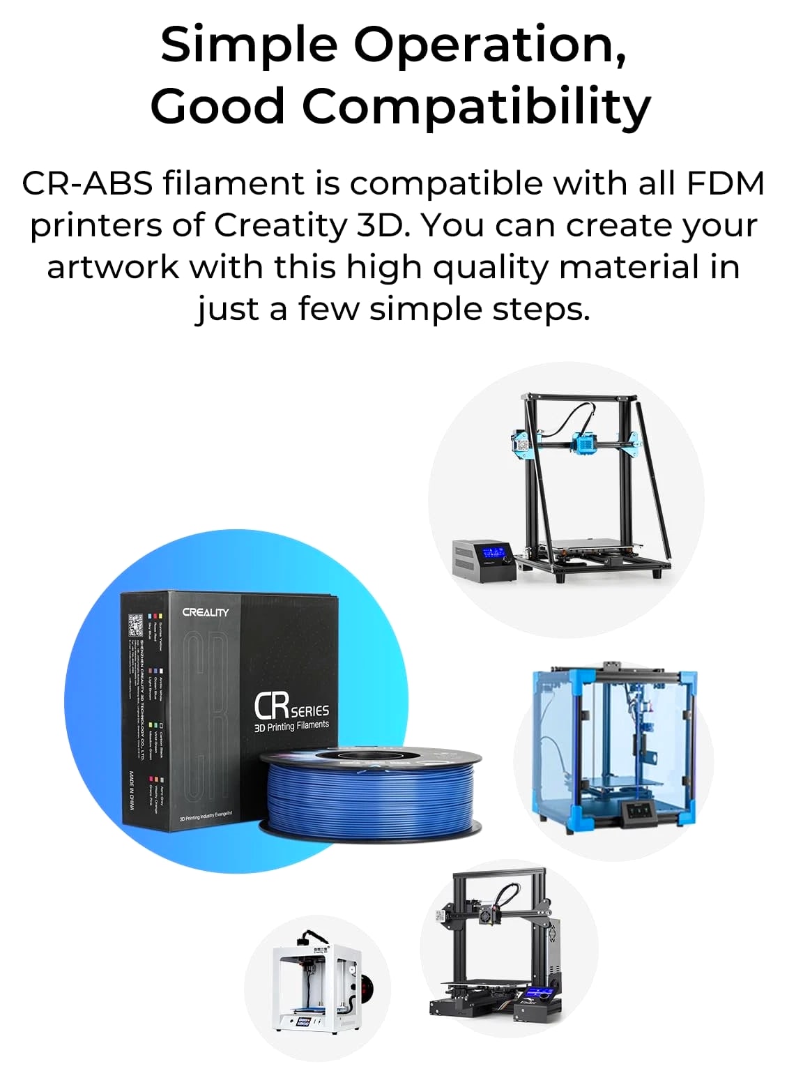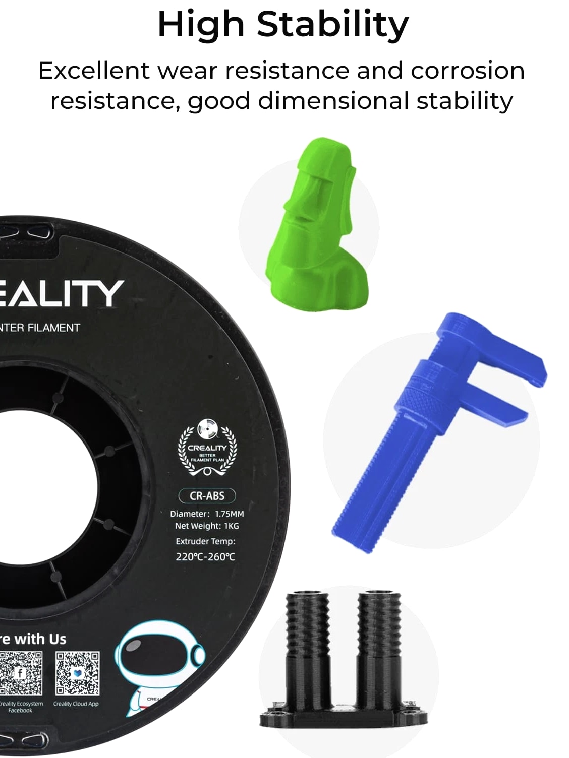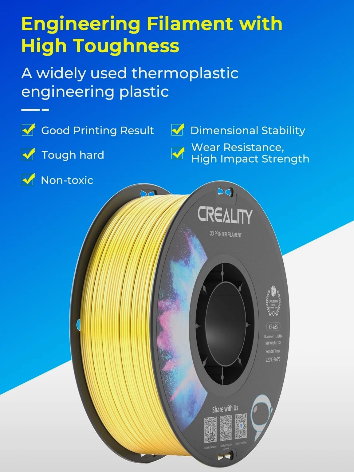 Engineering Filament: CR-ABS has excellent impact resistance and heat resistance. A widely used thermoplastic engineering plastic. Good printing results: Compared with ordinary ABS, printing of large objects with edges and corners shows obviously improved layer separation, warping, splitting and other phenomena; the solution has strong fluidity, and the printing is smooth. Non-toxic & compatibility: In the 3D printing process, no harmful substances are emitted, safe and non-toxic. Simple operation, good compatibility with all FDM printers. Good physical performance: Tough, hard, rigid, no layer separation or warped edges. Excellent wear resistance and corrosion resistance, good dimensional stability. Support: Provides 12-month warranty & 24 hours customer service. Note: Please place this product in a dry and ventilated environment, not in high temperature, sunny or humid conditions.