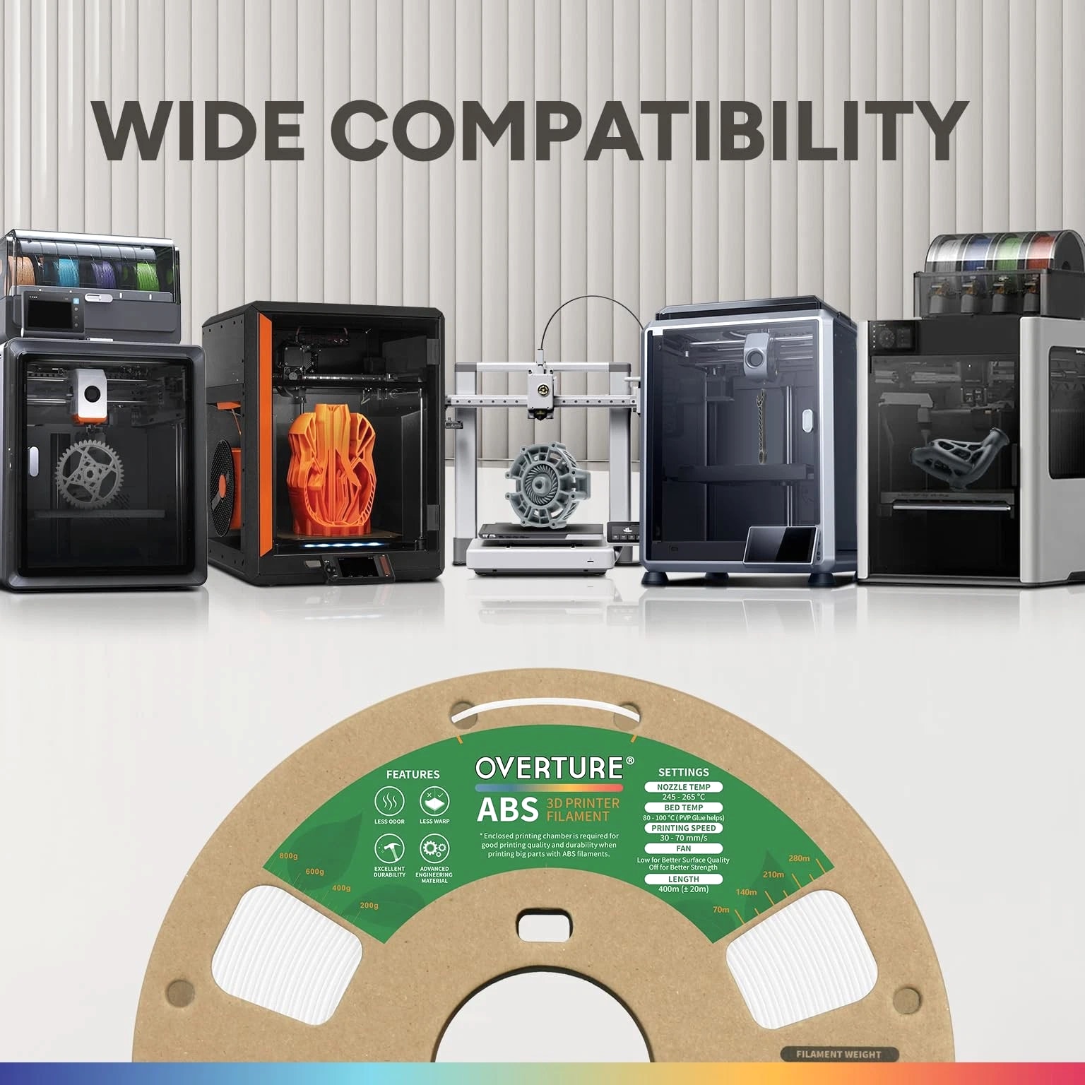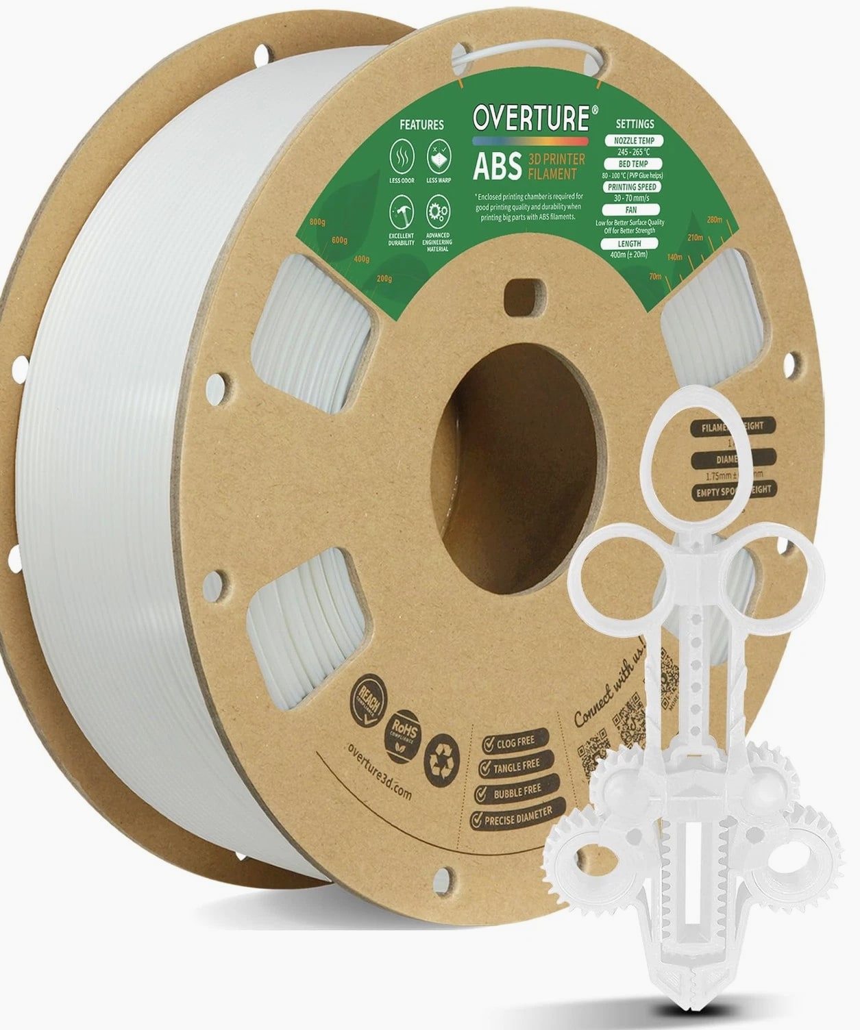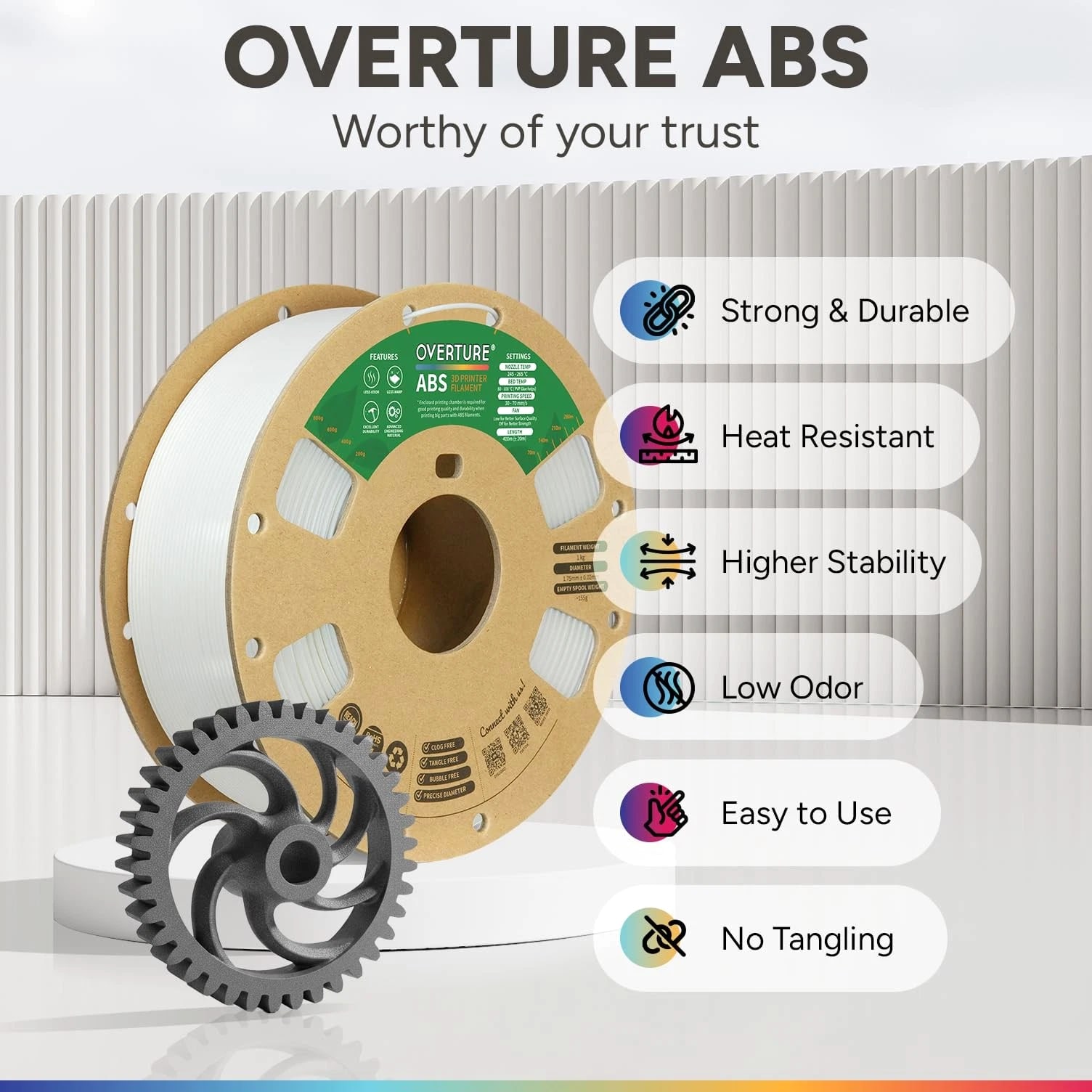 Note: The recommended print setup for materials could be slightly different from other filaments; Pls read the description below, you may also some practical suggestions through QA/ Top Review from others. FAQs: Why can't the materials stick to the build bed? 1. Check the temperature setting before printing, ABS materials have higher extrusion temperature; 2. Check if the plate surface has been used for a longtime, it is recommended to replace it with our new to ensure a strong first layer adhesion; 3. If the first layer has poor adhesion, it is recommended to re-level the print substrate to reduce the distance between the nozzle and the surface plate; 4. If the effect is not good, it is recommended to try printing the draft before printing. Specification: Recommended Extrusion/Nozzle Temp: 245 °- 265°(473℉~ 509℉), Heated Bed Temp: 80°- 100 °(176℉~ 212℉)/ PVP stick helps Printing Speed: 30~70 mm/s (1,800~4,200mm/ min) Fan: Low for better surface quality; Off for better strength Raft Material Diameter and Accuracy: 1.75 mm +/- 0.02 Material Net Weight: 1 kg (2.2 lbs) Packaging: 1 × spool of ABS materials 【Superior Strength & High-Temperature Resistance】Engineered for durability, ABS Material withstands higher temperatures than standard 3D printing materials, making it the ideal ABS option for functional prototypes, automotive parts, and enclosures that require exceptional heat resistance and toughness 【User-Friendly Spool with Thoughtful Design】Experience hassle-free printing with our innovatively designed spool. Featuring a grid layout for easy tangle management, a clear length/weight gauge, a viewing hole, and a larger inner diameter for smoother feeding, this ABS Material spool is built for convenience and efficiency 【Smooth, Glossy Finish for Professional Prints】Produce parts with a polished, professional look. ABS is formulated to yield a characteristically glossy surface finish straight off the print bed, reducing the need for extensive post-processing and