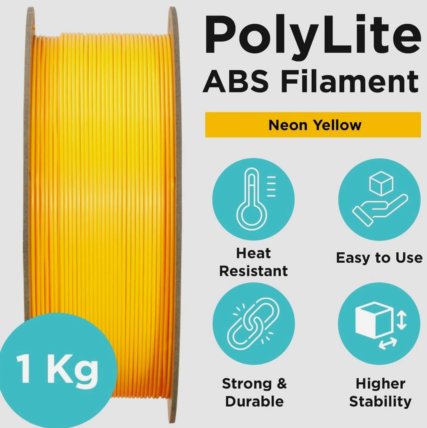 Neon ABS Filament, Neon Yellow 3D Printing Material Heat Resistant 1kg - UV Reactive ABS 3D Printer Filament, Strong & Durable, Dimensional Accuracy +/- π‘οΈ Impact and Heat Resistant: PolyLite ABS 3D printing filament is a durable material that minimizes jamming. With a Vicat Softening Temperature of 104ΛC and strong mechanical properties, PolyLite ABS 3D printer filament is perfect for functional parts that need durability and high-temperature resistance. π οΈ Enhanced Stability: PolyLite ABS 3D printing filament (Acrylonitrile Butadiene Styrene) is crafted from a specialty bulk-polymerized ABS resin, featuring significantly lower volatile content than conventional ABS. For outdoor applications requiring UV resistance, we recommend our UV-resistant ASA filament. π Moisture-Free: ABS 3D printing filament is packaged in a vacuum-sealed resealable bag with desiccant and comes in a sturdy, sealed box for optimal printing performance and protection. β»οΈ Cardboard Spool: Available in upgraded packaging, featuring a fully recycled cardboard spool and box. β οΈ Important Note: Pass the ABS 3D printing filament through the fixed hole after use to prevent tangling. A heated bed and suitable printing surface are necessary to prevent warping. Larger parts are more susceptible to warping on home printers, and the odor during printing is stronger than with PLA. Using a raft or brim, or slowing down the first layer, can help minimize warping. ABS Filament ASA Filament Basic PLA Filament Matte PLA Filament PLA PRO Filament High Speed PETG Filament Customer Reviews out of 5 stars 1,861 out of 5 stars 2,110 out of 5 stars 7,603 out of 5 stars 943 out of 5 stars 3,619 out of 5 stars 1,949 Price $$ $$ $$ $$ $$ $$ Material Type ABS ASA PLA PLA PLA PRO PETG (New Formula) Special Feature Impact and Heat Resistant, Lower rigidity, higher toughness UV-resistant, Impact and Heat Resistant, Lower rigidity, higher toughness E