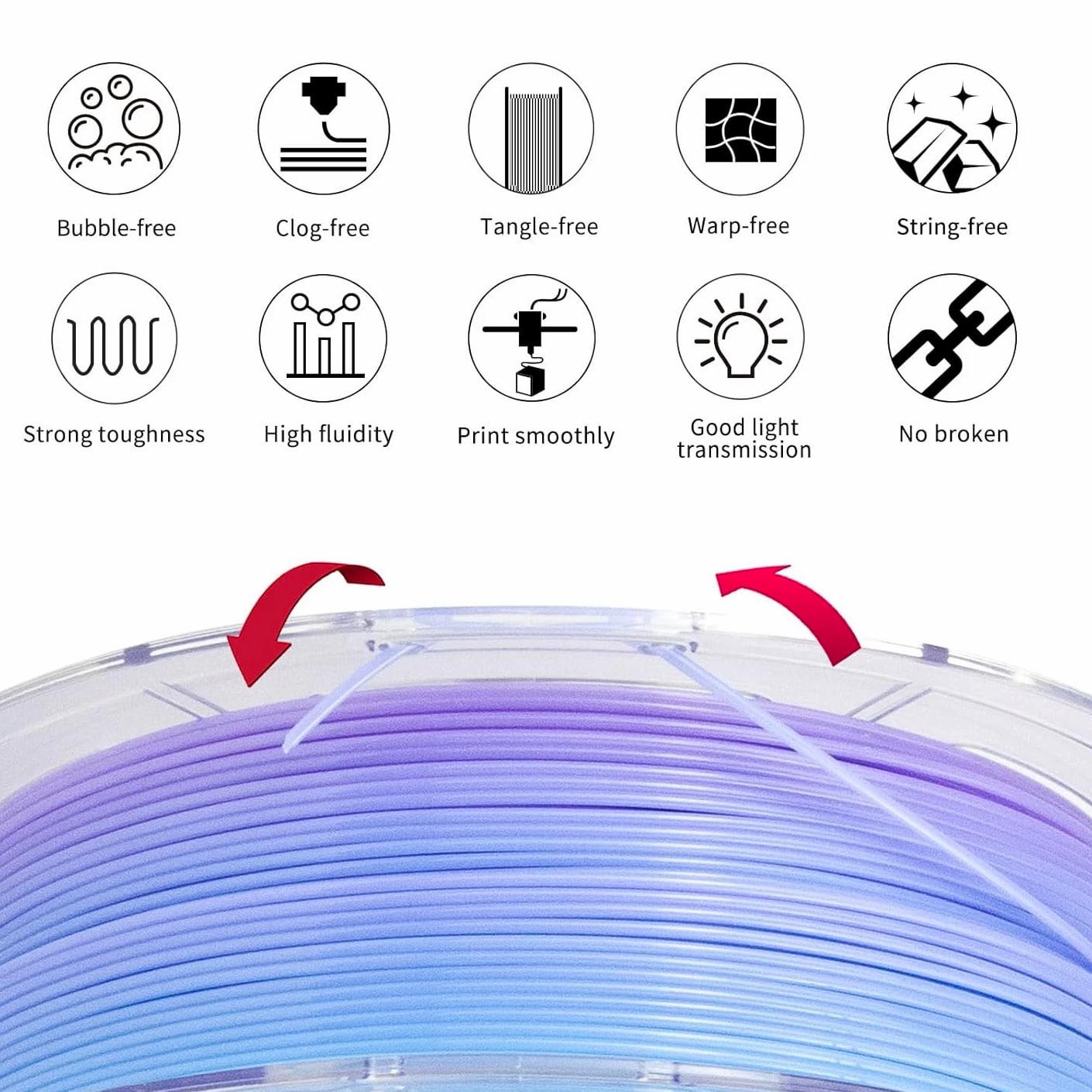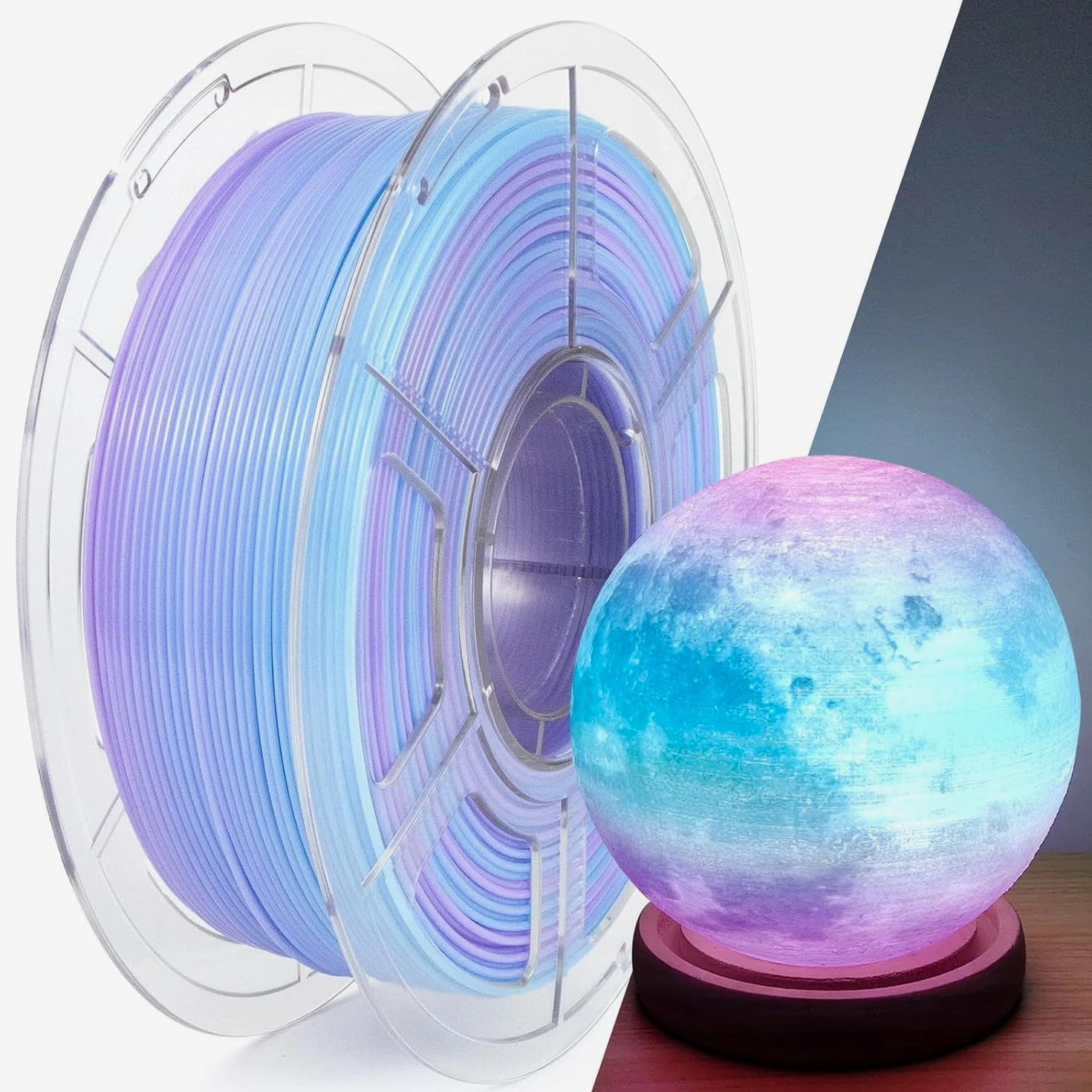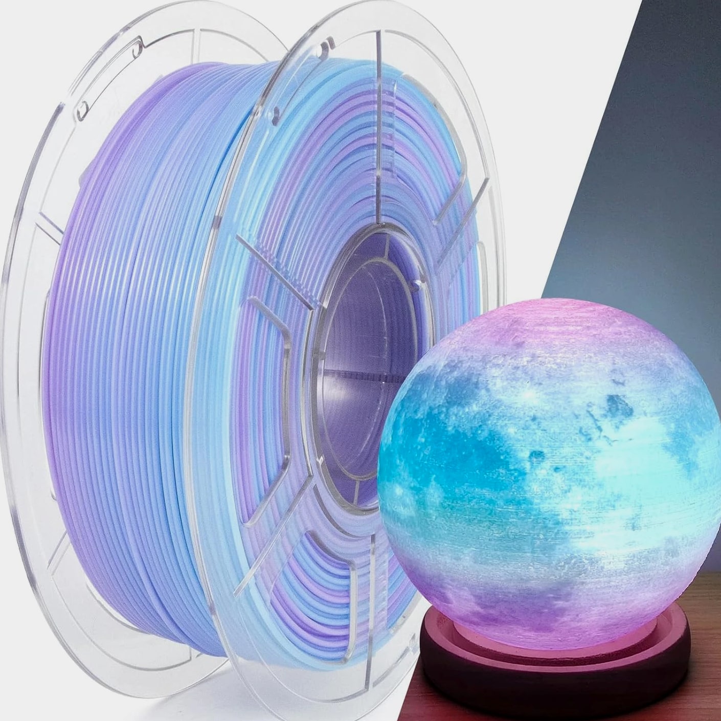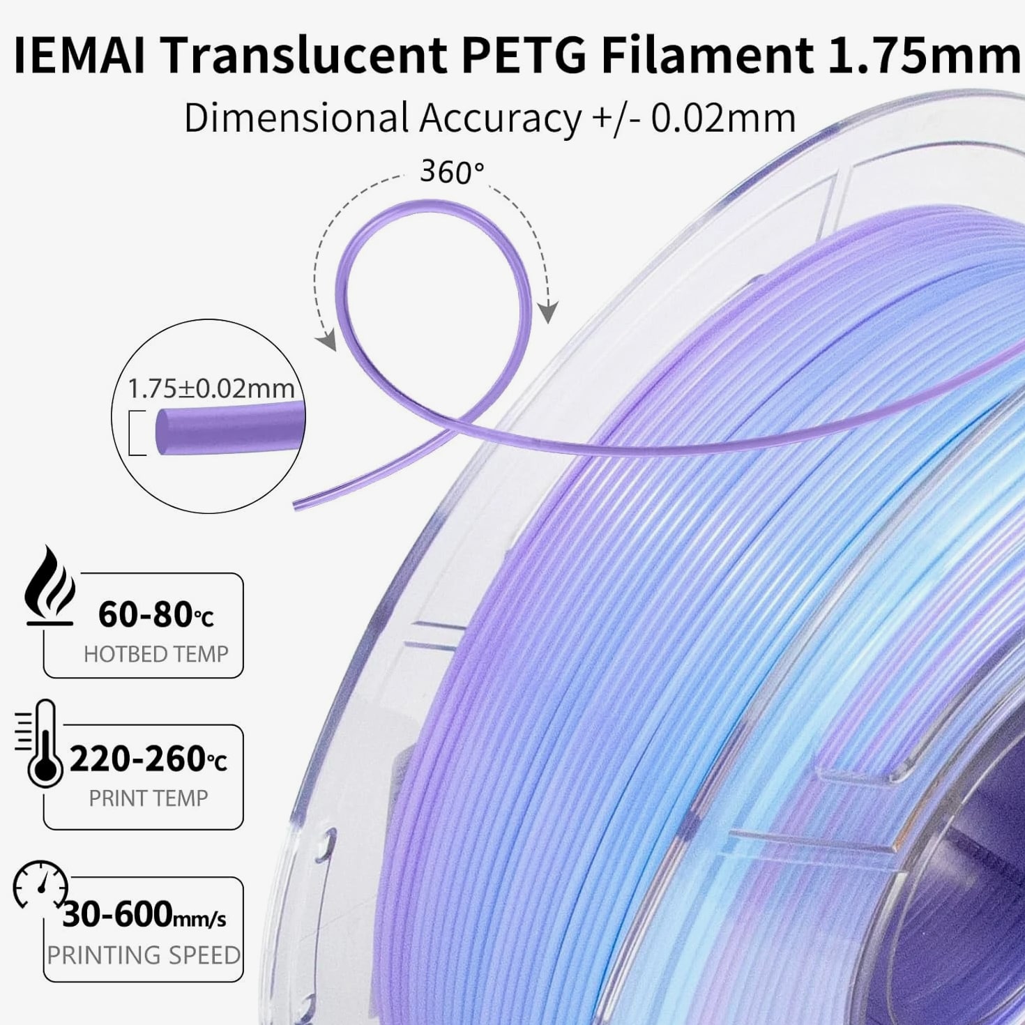 PETG Filament 1.75Mm, Translucent Dual Color Gradient Blue to Purple, High-Speed 3D Printer Filament up to 600Mm/S, 1Kg Spool for Artistic Creations & Home Decor Specifications Material: Polyethylene Terephthalate Glycol Color: Gradient Blue to Purple 1kg Item Diameter: 1.75 Millimeters Item Weight: 1.2 Kilograms Size: 1KG 【Gradient Translucent Visual Effect】IEMAI gradient translucent PETG features a smooth blue to purple color transition. Semi-transparent finish creates layered depth and gradual color transitions, ideal for lampshades, artistic models, decorative prints, and display pieces. 【High-Speed PETG up to 600mm/s】Built for high-speed and standard printing, this upgraded PETG supports printing speeds from 30–600mm/s while ensuring stable extrusion, clean surfaces, and minimal stringing—excellent for rapid prototyping and detailed decorative work. 【Strong Layer Adhesion & Stable Printing】Manufactured from premium PETG material, our 3D printer filament provides excellent interlayer bonding, minimal shrinkage, and robust bed adhesion. More durable than standard PLA, it delivers reliable performance for extended prints and larger models. 【Precise Diameter & Tangle-Free Spool】Created with strict 1.75mm ±0.02mm diameter tolerance, the PETG extrudes consistently for reliable flow and quality prints. Each spool is carefully wound, vacuum-sealed with desiccant to reduce moisture and prevent tangling. 【Tips & Recommended Settings】💡Guidance: ①Pre-dry at 70°C for 8–12 hours if needed; ②Adjust wall thickness to control light transmittance; ③Adjust model size to modify color gradient. Suggested nozzle temperature: 220–260°C; bed temperature: 60–80°C; printing speed: 30–600mm/s.