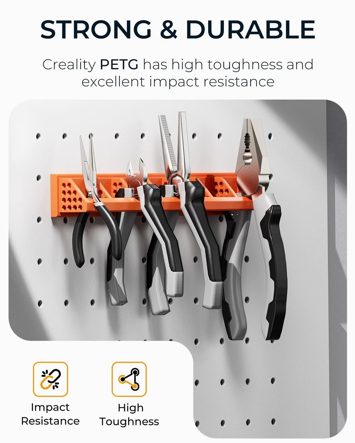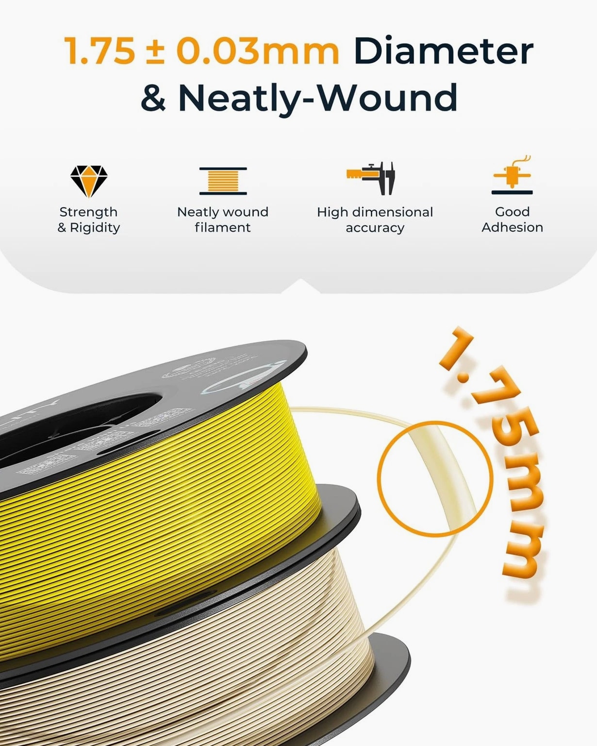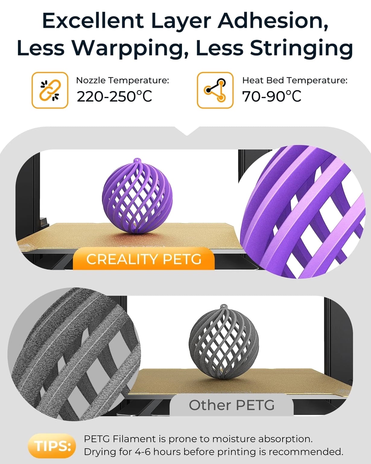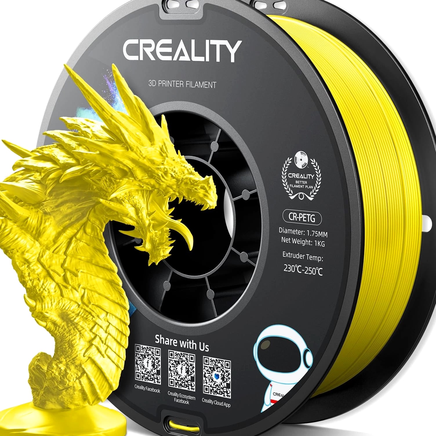 • 【Creality CR-PETG Filament】Creality CR-PETG combines the benefits of PLA and ABS to reach eco-friendly and odorless performance. This PETG Filament features good toughness to avoid cracking and warping, enabling excellent 3D printing. • 【Toughness-enhanced PETG】Creality PETG chooses durable and strong material that delivers excellent clarity, light transmission, and a glossy finish. It is recommended to use a printing temperature of 220-250°C and a base plate temperature of 70-80°C for superior printing results. • 【Tangle-Free & Neatly Wound】We ensure that every PETG filament is tightly and neatly wrapped by utilizing full mechanical winding, which effectively minimizes tangles, filament snapping, and line breakage. • 【No Clogging & No Bubbles】Our filaments are thoroughly dried and carefully vacuum sealed to protect them from moisture and dust, which ensures that there will be no issues with clogging or bubbling during printing. Our PETG is designed to be perfectly compatible with the majority of 1.75mm FDM 3D printers, especially suitable for Creality 3D Printers! • 【High Precision & Consistent Performance】Our PETG filament boasts a diameter of 1.75mm, ensuring utmost accuracy with a tolerance of only +/- 0.03mm. With strict quality control and impeccable dimensional precision, our PETG filament guarantees smooth and steady feeding during printing.
