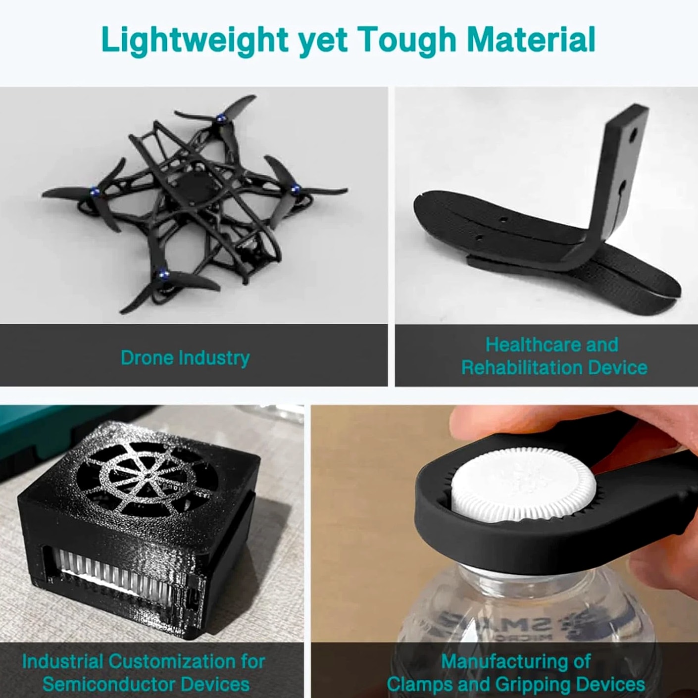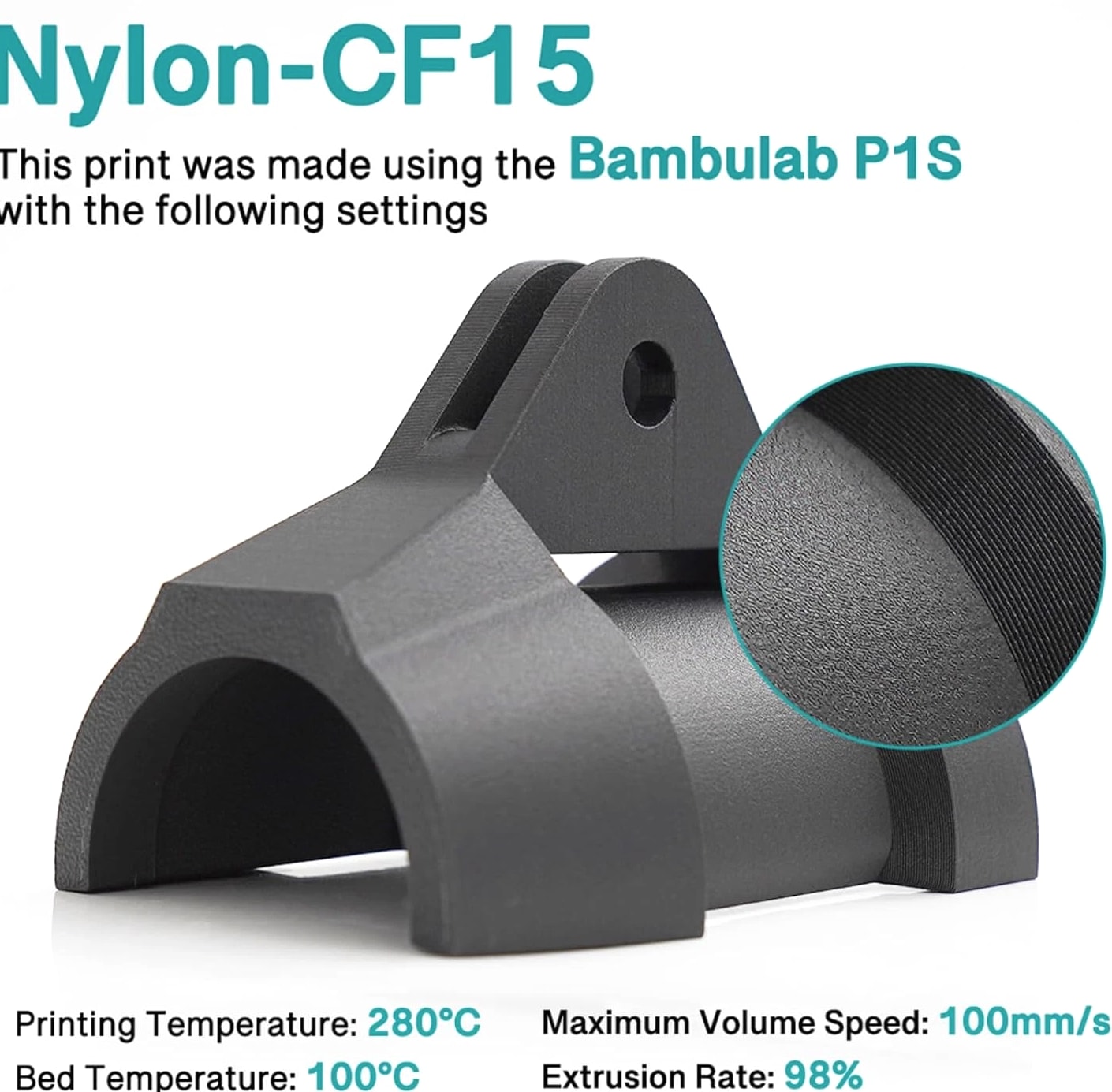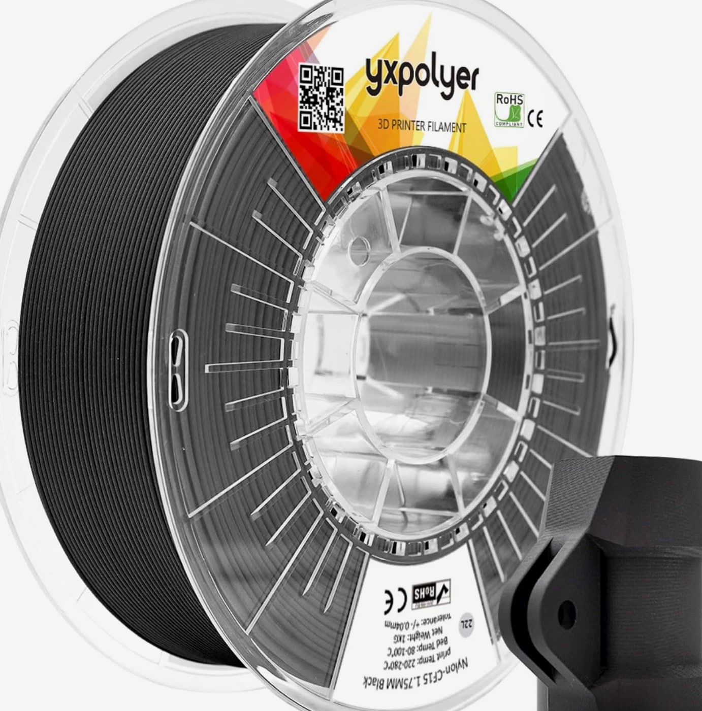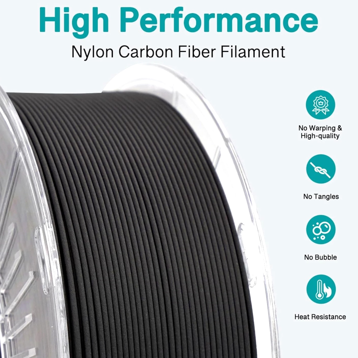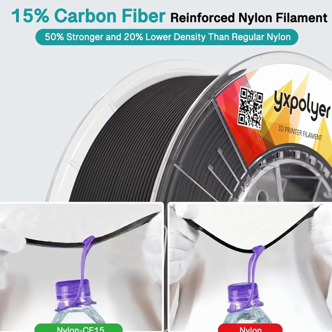 Carbon Fiber Nylon Filament 3D Printer Filament PA6-CF Filament 1.75Mm 1Kg with PC Spool, PA6 CF 3D Printing Filament Description Unit Count 1.0 Count Warranty Description 1 Year Item Diameter 1.75 Millimeters Number of Items 1 Color 1kg Material Carbon Fiber, Nylon Material Type Carbon Fiber, Nylon Manufacturer Part Number PETG CF Item Weight 1 Kilograms Size PA6-CF High Strength and Rigidity: Incorporates 15% short carbon fibers, significantly enhancing tensile strength and rigidity. Maintains structural stability under high loads or stress, with minimal deformation. Heat Resistance & Dimensional Stability: Delivers exceptional mechanical performance and dimensional stability even under high temperatures. Reduces the risk of material fatigue and deformation for parts exposed to prolonged high-temperature conditions. Lightweight Design: Thanks to the low-density properties of carbon fiber, printed parts achieve both high strength and lightweight characteristics. Ideal for aerospace and automotive applications, effectively reducing weight while improving overall performance. Superior Chemical Resistance: Resistant to various chemicals, including acids, alkalis, oils, and solvents. Ensures long-lasting durability and reliability even in harsh industrial environments. Versatile Applications: Widely applicable in automotive components, mechanical fixtures, electronic device mounts, and aerospace structures. Excels in both prototyping and end-use scenarios, offering outstanding mechanical properties and thermal stability. Product description Other YXPOLYER Engineering-Grade Filaments Customer Reviews 4.3 out of 5 stars 49 4.3 out of 5 stars 45 4.5 out of 5 stars 2 4.5 out of 5 stars 76 4.8 out of