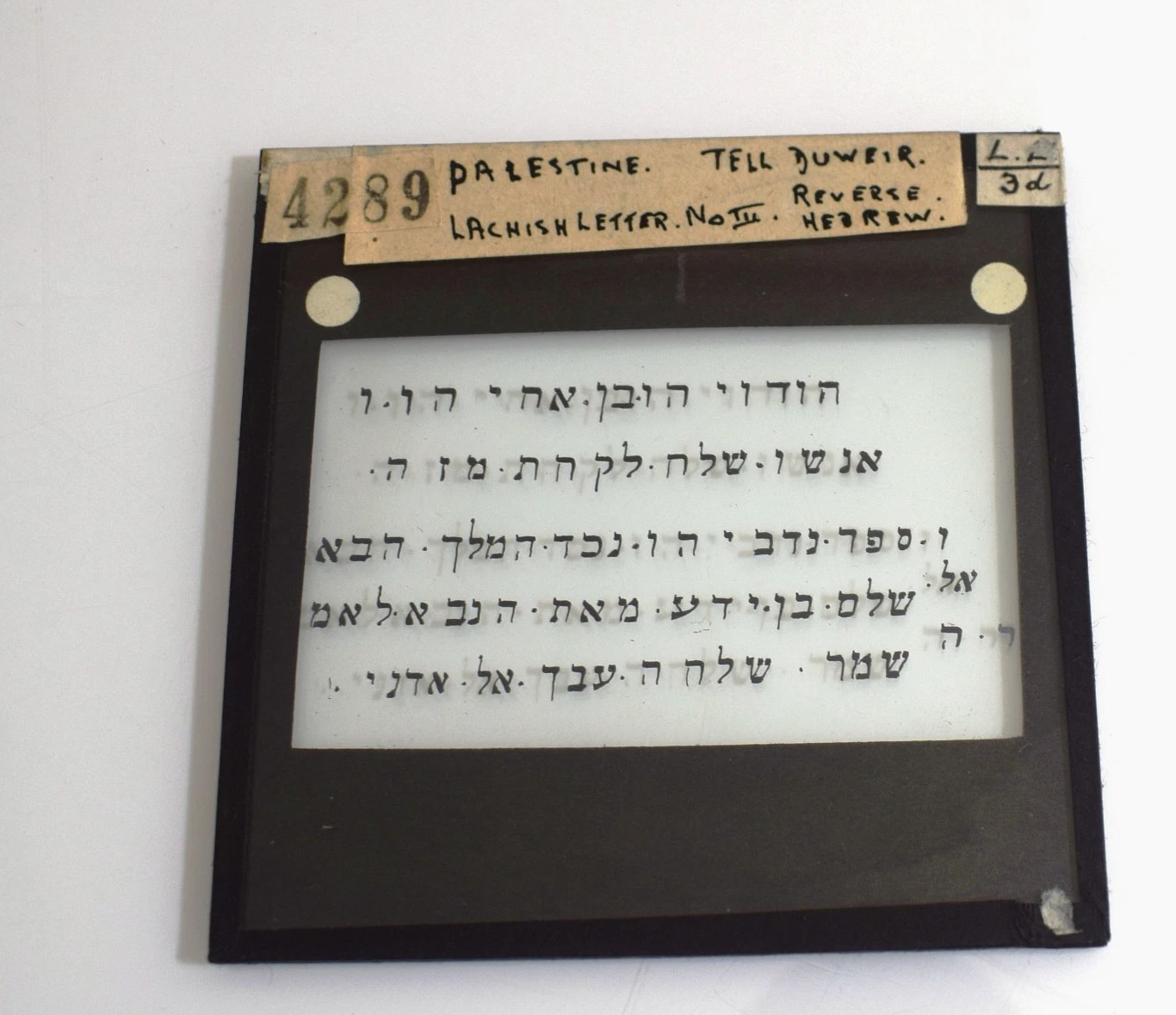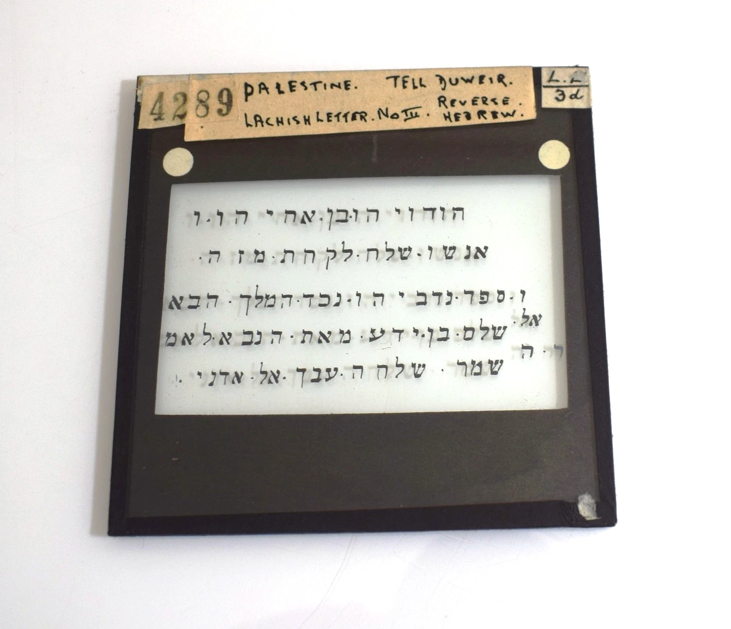 TEL LACHISH EXCAVATION NO31 C1938 Vintage Magic Lantern Slide ISRAEL Specific Title: Palestine Tell Duweir 4289 Lachish letter No III reverse hebrew. On the rear (not visible in photos): "University of London" "Institute of Archaeology" The first expedition at Lachish, then Tell ed-Duweir, from 1932 to 1939, was the Starkey-Tufnell British expedition which included James Leslie Starkey as expedition leader, Olga Tufnell, G.L. Harding and C. Inge. It was funded by Charles Marston and Henry Wellcome with the aim of finding the Biblical city of Lachish. They succeeded in locating Lachish, with a "wealth of well-stratified pottery", a "key part of the ceramic corpus of Palestine", and the Lachish letters "written to the commander of the garrison at Lachish shortly before it fell to the Babylonians in either 589 or 586 B.C." Starkey was murdered in 1938 while travelling to Jerusalem to open the Rockefeller Archaeological Museum. Tufnell, Harding and Inge remained for the 1938–1939 season. Tufnell returned to London and over the next two decades, worked at the Institute of Archaeology in London, "sorting, collating, studying and presenting the material found at Lachish"; as these slides are titled "Institute of Archaeology," I am confident that this slide is part of the work she did to allow her to present her findings—a true connection to the event. I have found very few examples of photos relating to his excavations at Lachish, and as a result feel that this and the others relating to the excavation are of significant historical importance. This slide would have been produced from the negative in a similar way a photo was produced, however it allowed the image to be enlarged so that a group of people could view it; for example, in a lecture. L654 G63