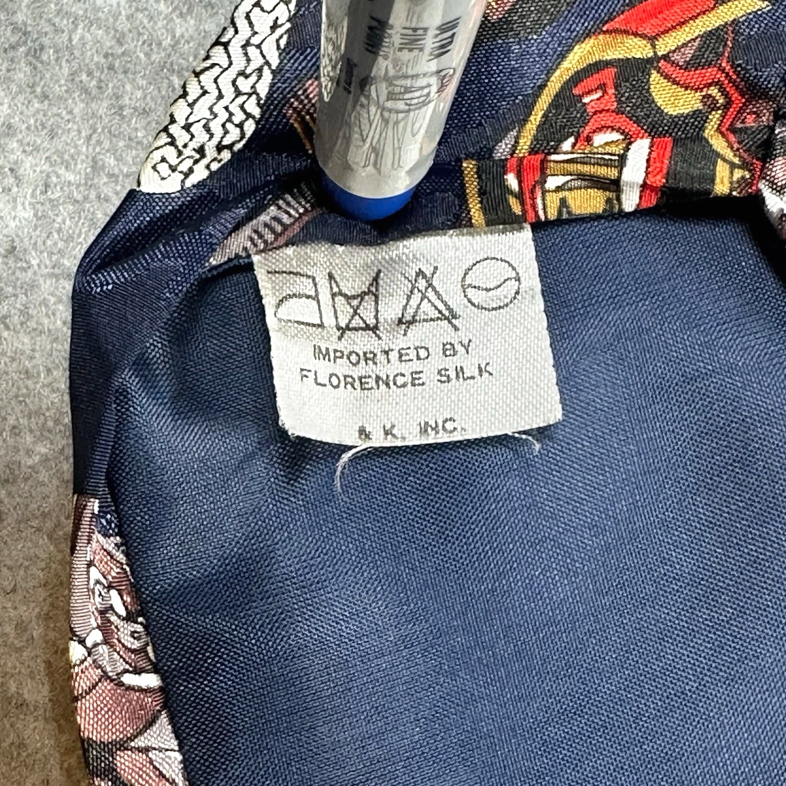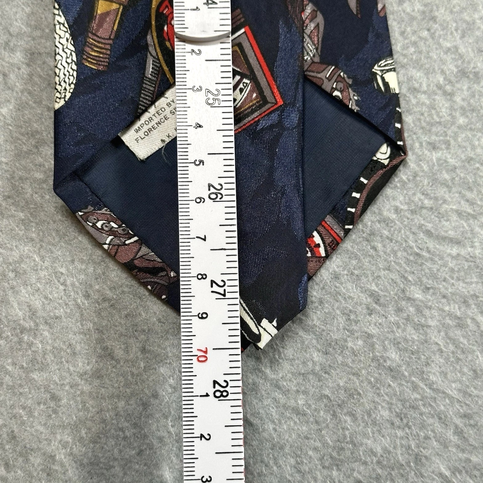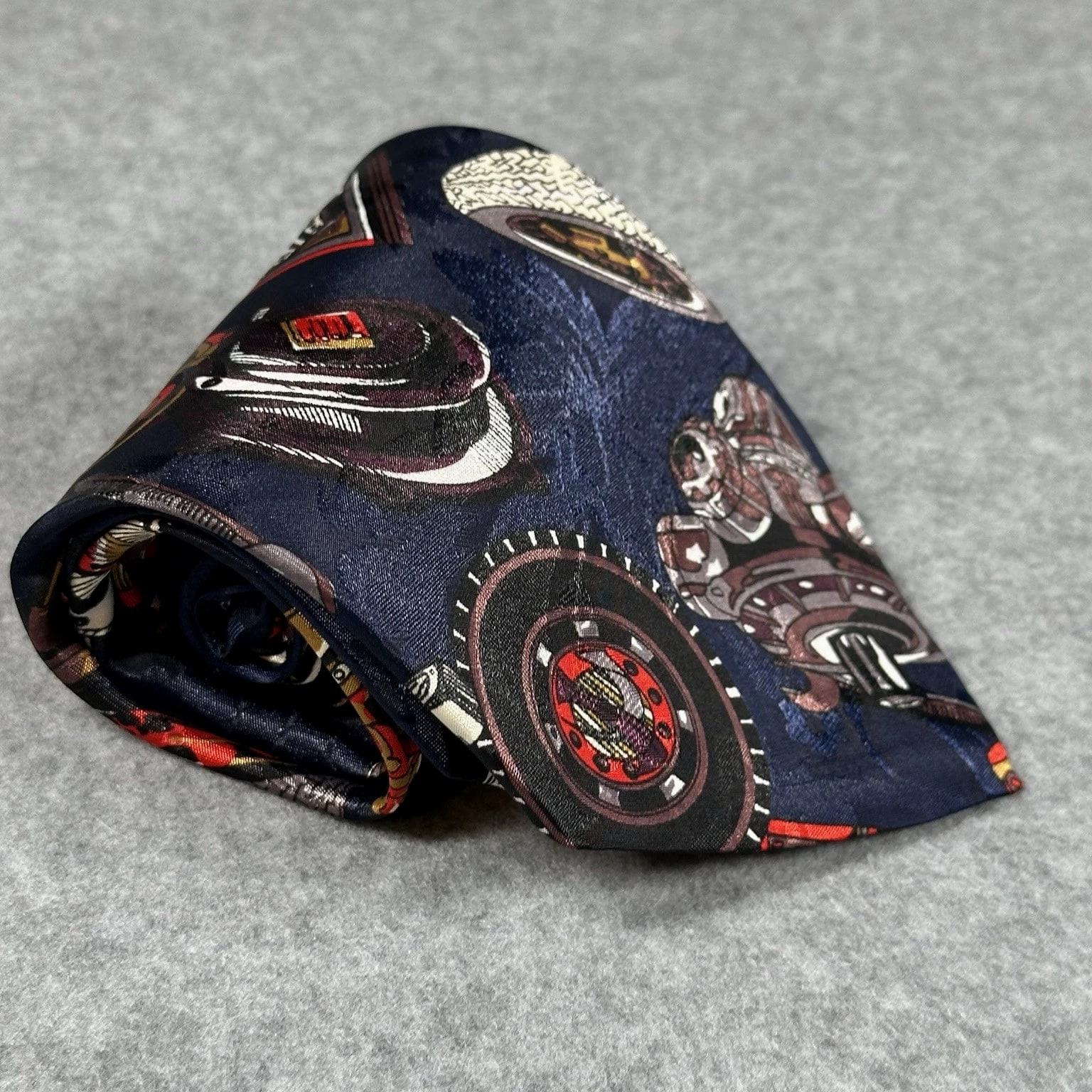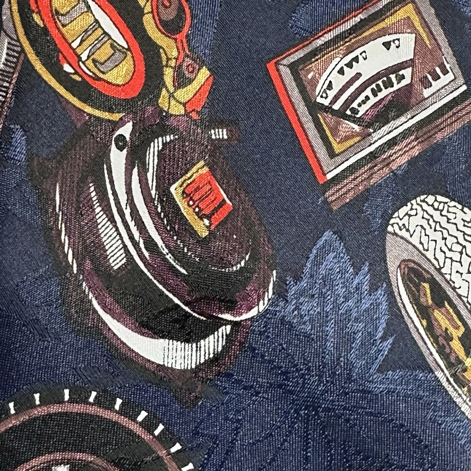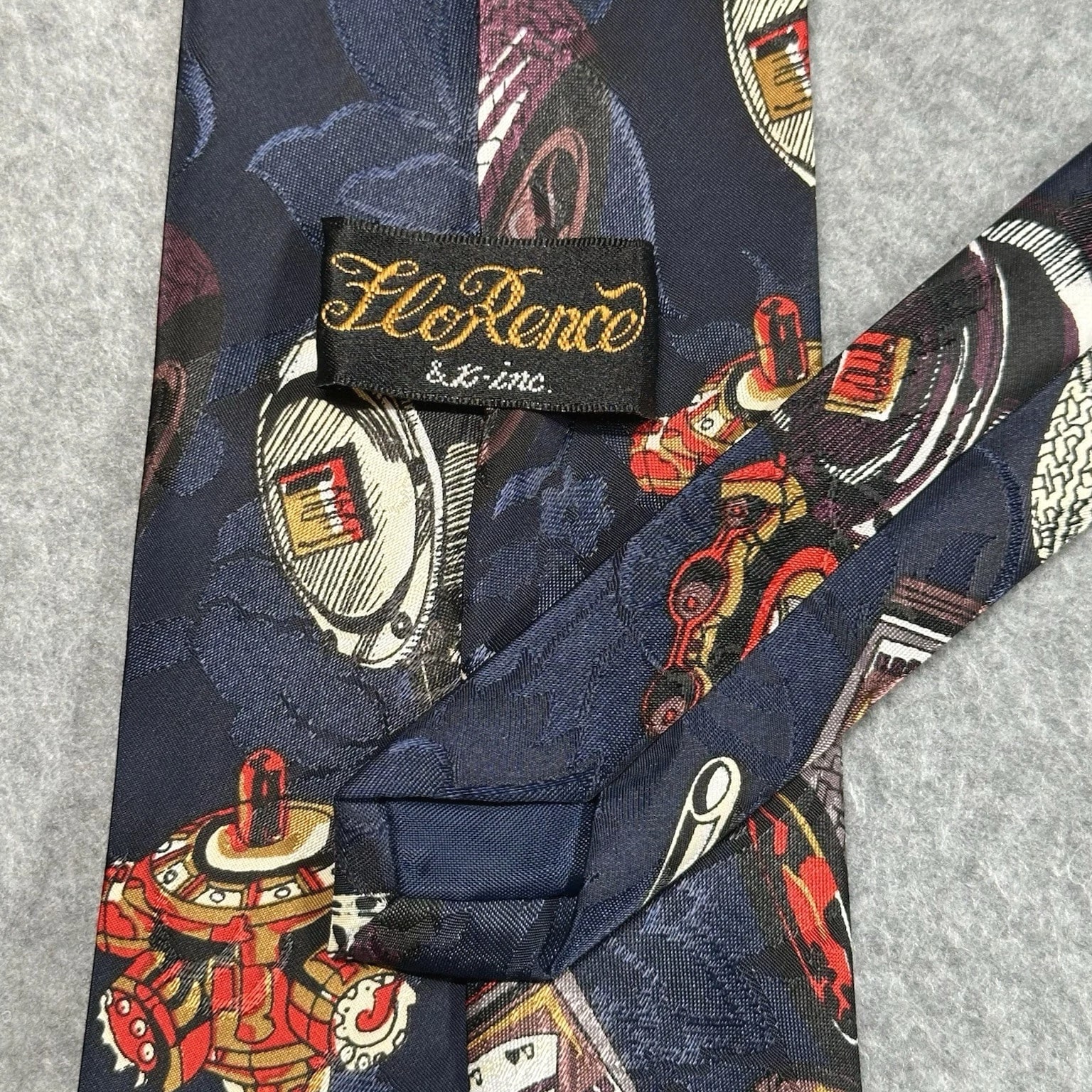 The product is a vintage Florence silk tie featuring a graphic print of automotive gauges, perfect for men who appreciate retro style in their accessories. The tie is a novelty item with navy blue color and measures 55 inches in length and 3.75 inches in width, making it wide enough to add a distinctive touch to any outfit. Made from silk and woven fabric, this designer tie from the 90s is a unique piece combining elements of cars, American culture, and abstract graphics, making it a standout accessory for those with a preppy or retro aesthetic.