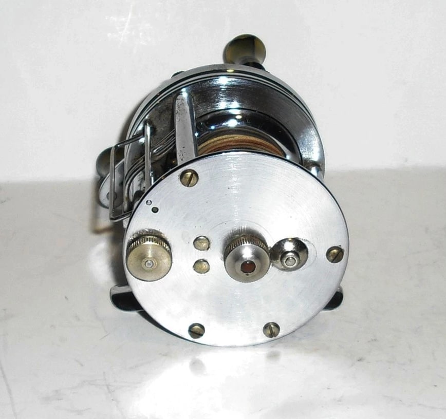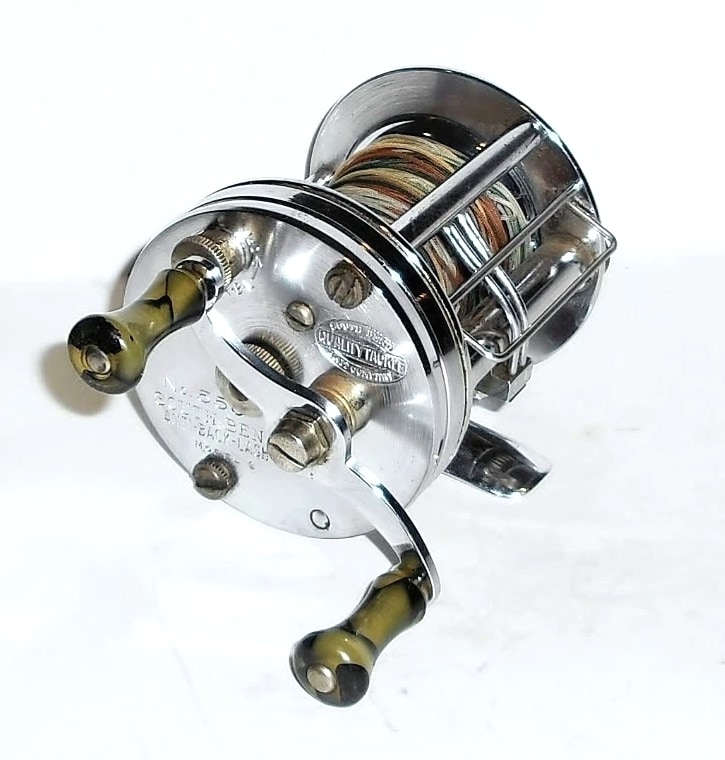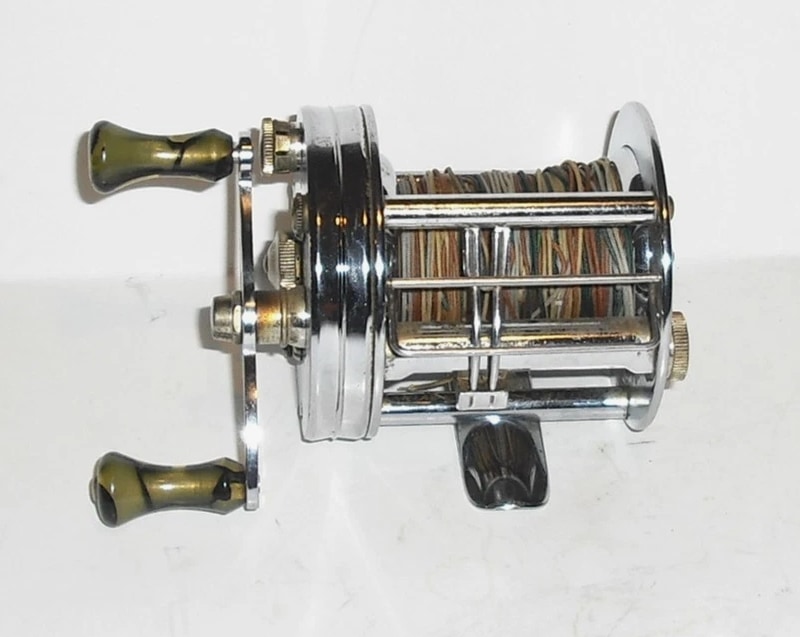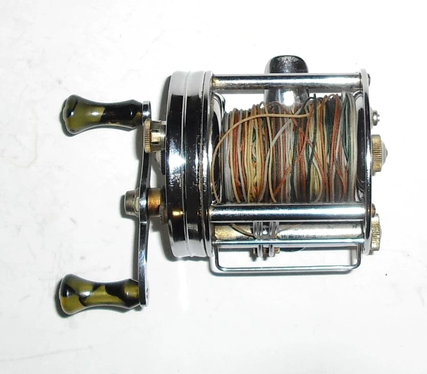 Features a level-winding design and a patented anti-backlash system engineered to prevent "bird's nests" by braking the spool when the line goes slack. ABL On/Off knob located on the handle side of the reel. Bakelite handles with jeweled movement. Still cranks smooth as silk. Bakelite handle knobs spin freely. Clicker works. Made in U.S.A. I have other vintage reels available. If you are interested in 2 or more items, please send a message with an offer. If we agree on a price I can relist those items as a lot in a private listing.