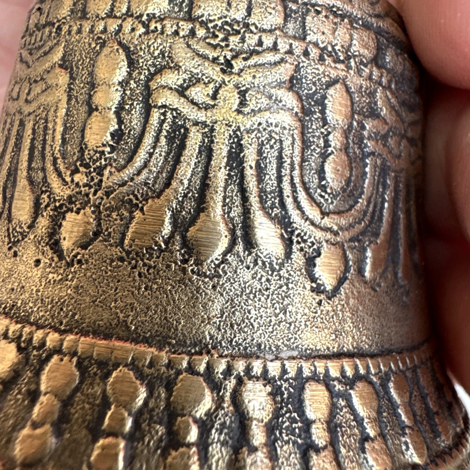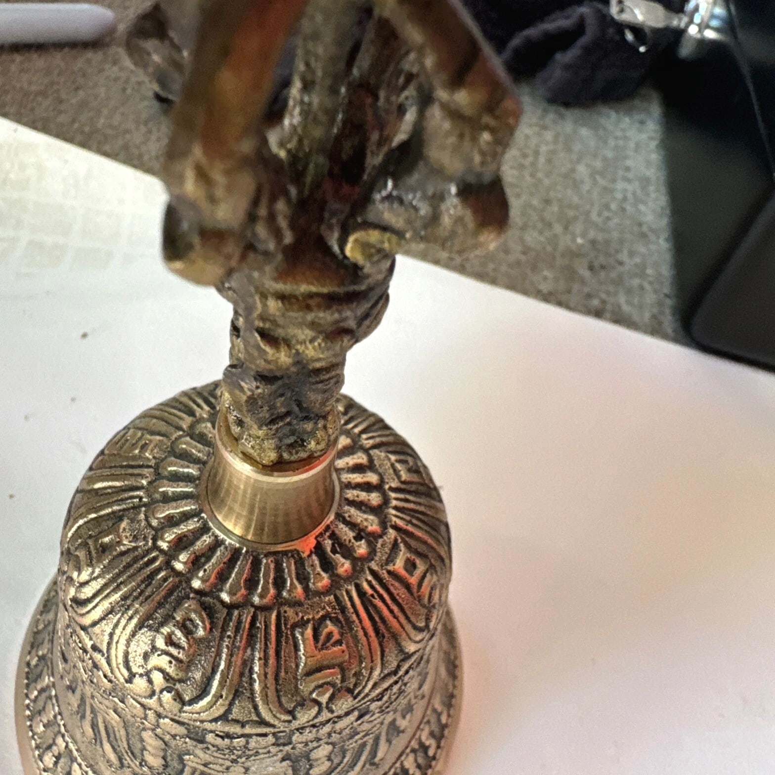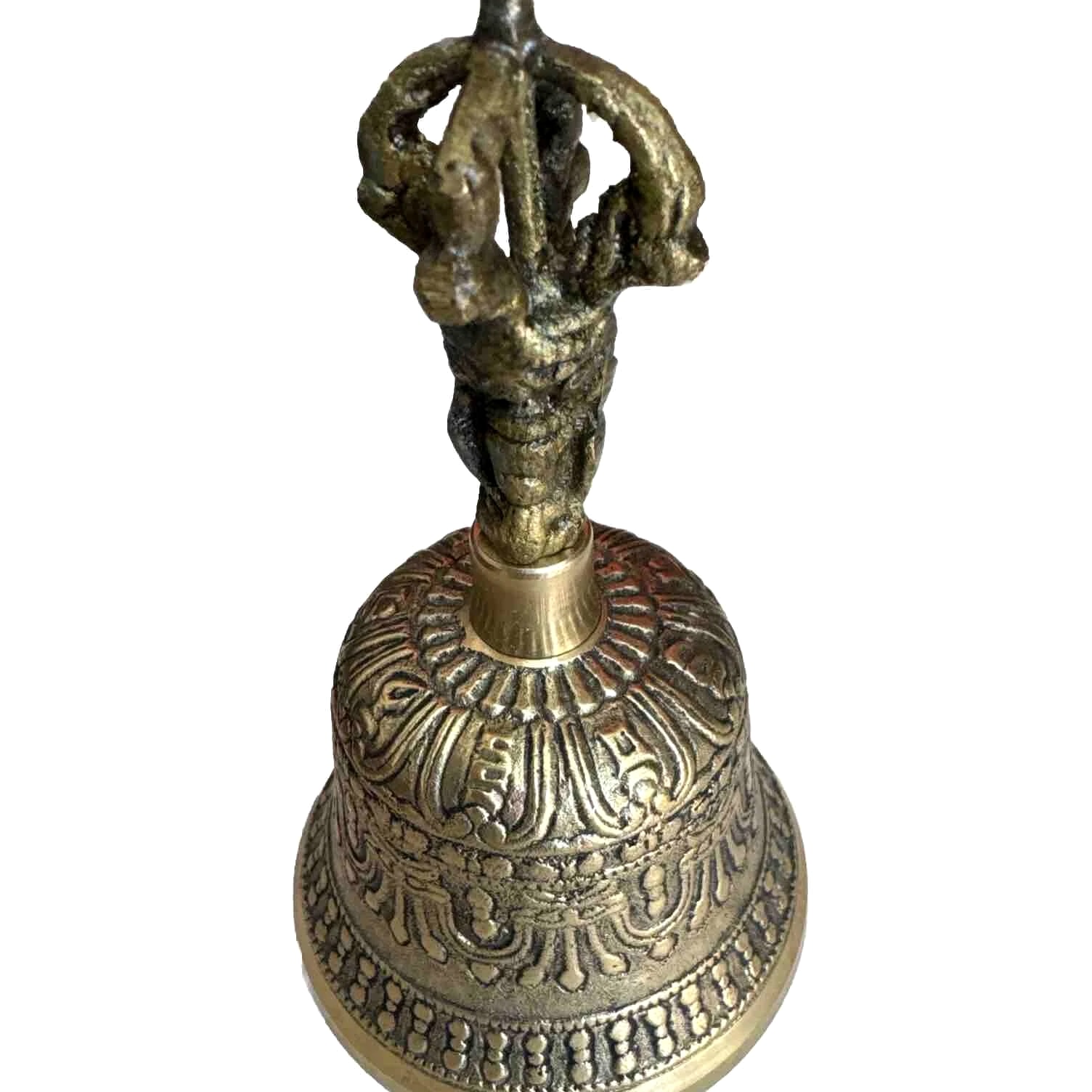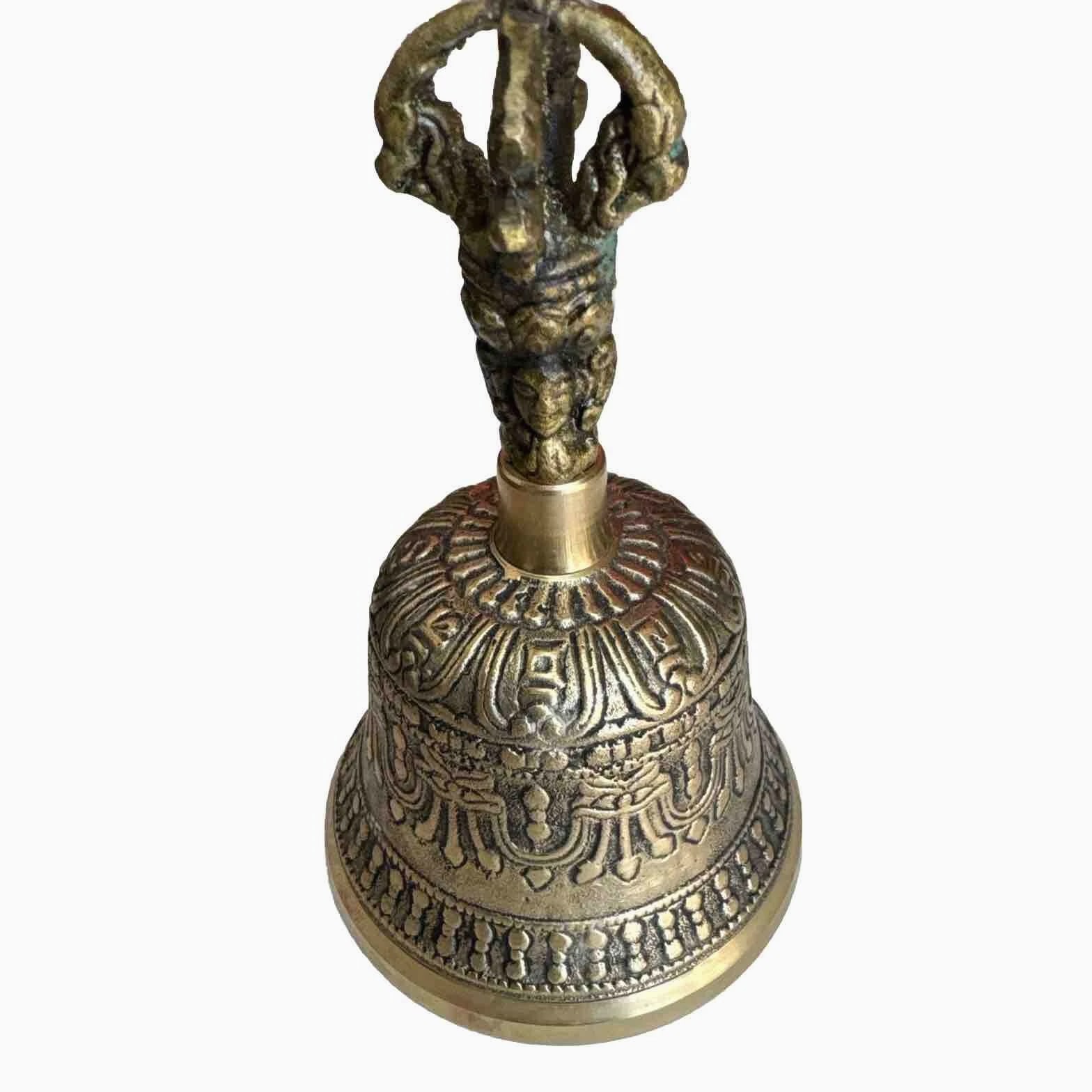 Vintage Ornate Brass Hand Bell with Buddha Face on Handle 6.25 inches
