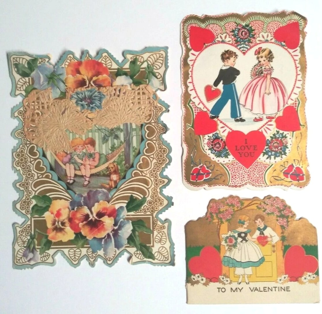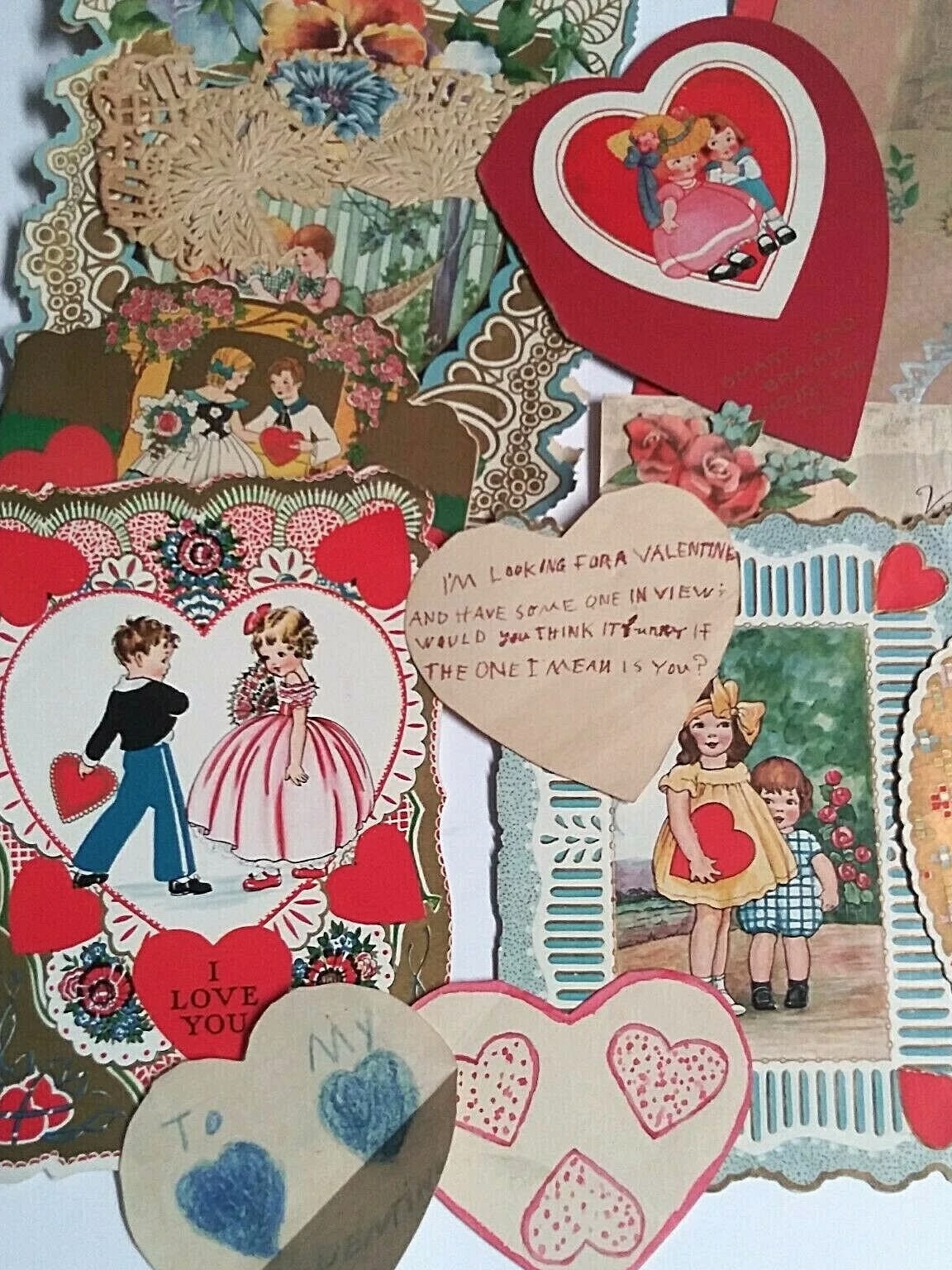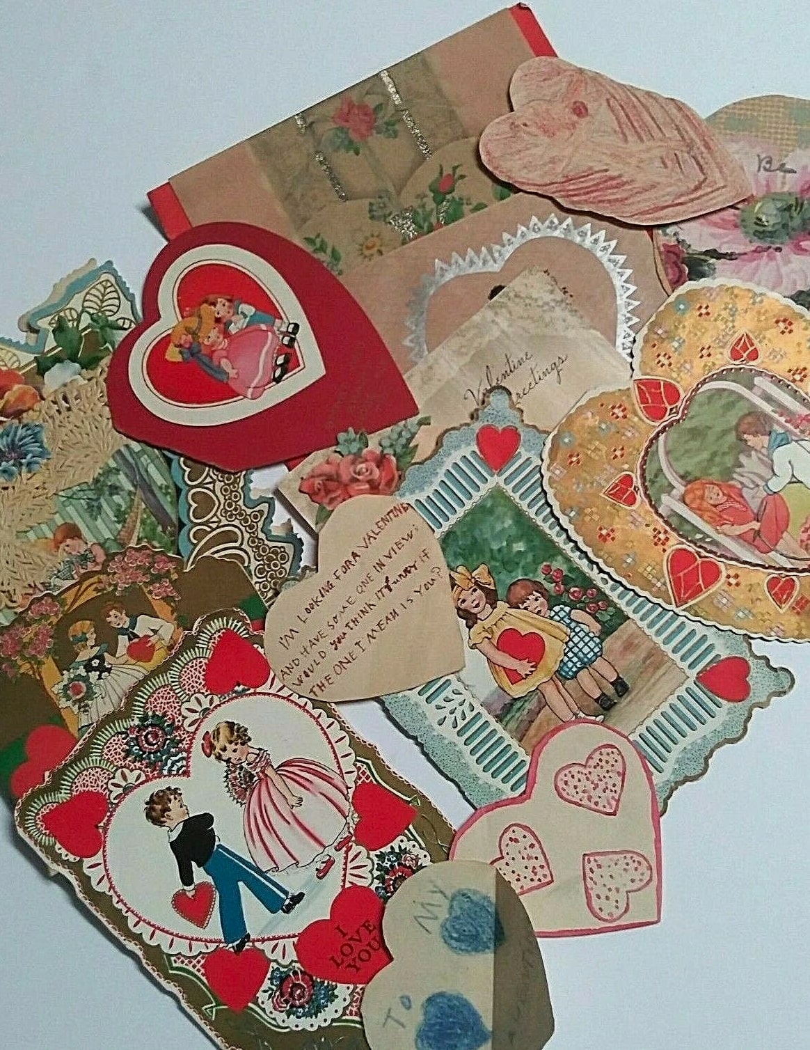 Valentine's Day diecut handmade vintage love hearts card lot (14 Pieces) 3"-8" each. Normal wear associated with an old Valentine may include creases, a corner bump, edge/corner wear, ink/writing on front/back, etc. See attached photos for better condition details. These will make an amazing addition to any collection. Please see my Store for more cool vintage finds.