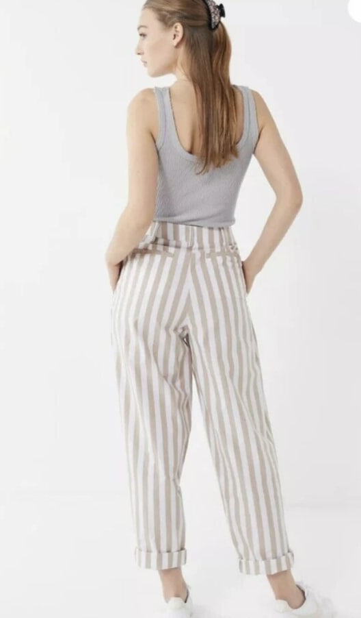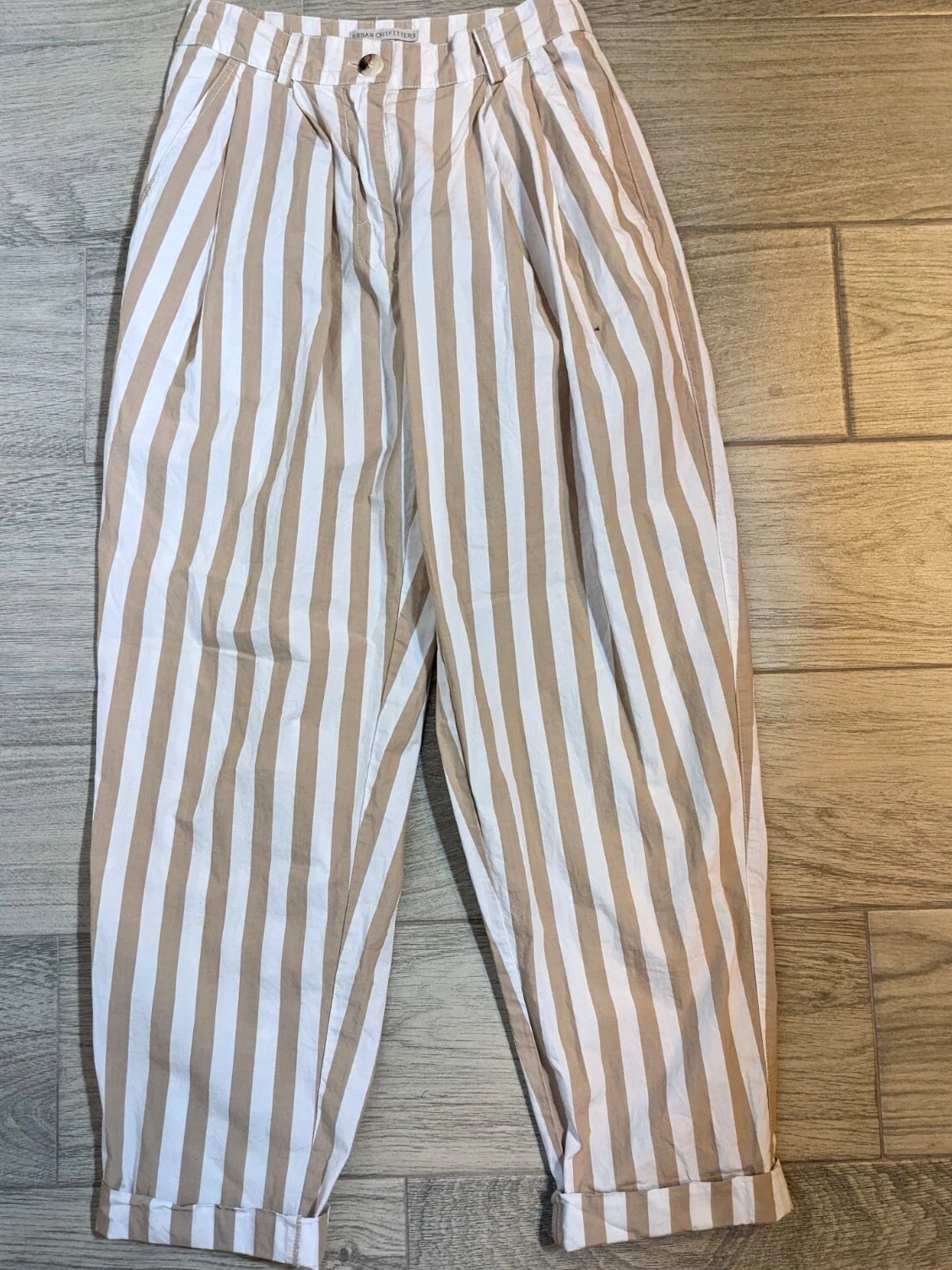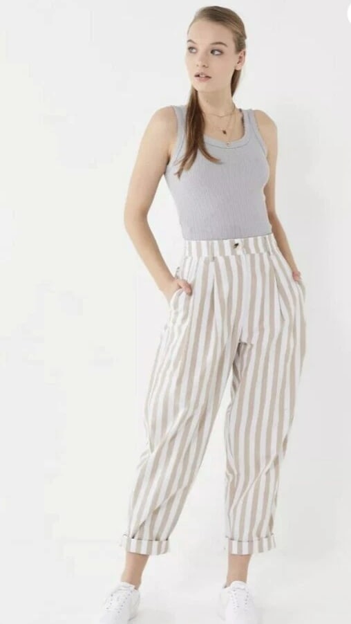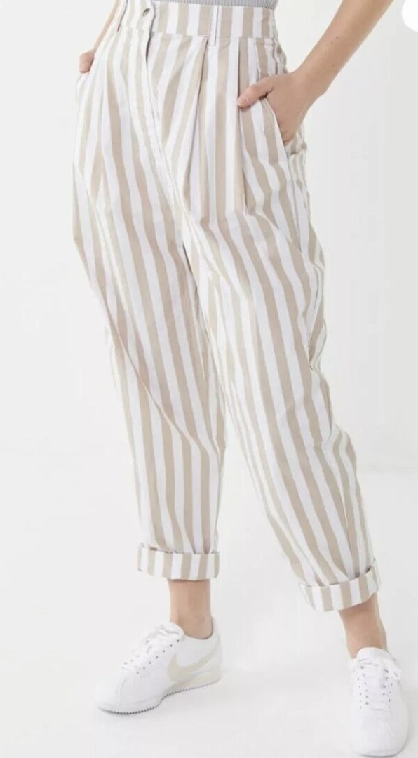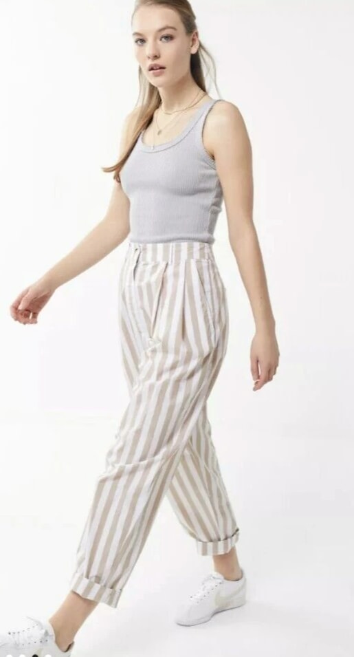 Elevate your casual wardrobe with these Urban Outfitters UO Percy Pleated High Rise Tapered Pants. The beige striped pattern adds a touch of 90s vibe to the relaxed fit. Pleated and button accents, along with the tapered leg style, provide both style and comfort. The cotton material with canvas fabric type ensures durability and breathability. Perfect for any casual occasion, these pants come in size 2 and feature a zip closure. The slimming feature of the pants enhances your figure. With its brand, department, type, and style, these pants are a must-have for any fashion-forward woman.