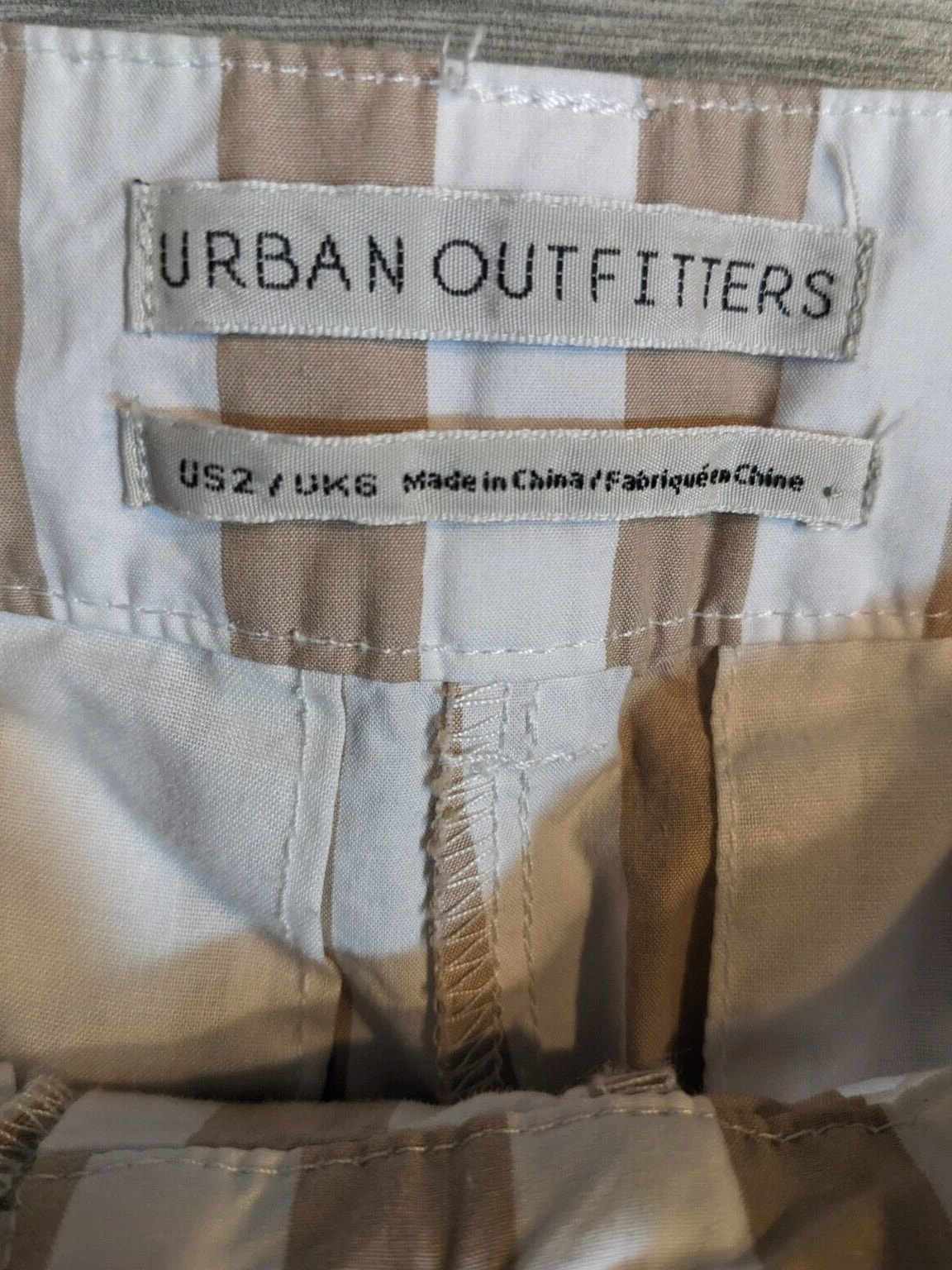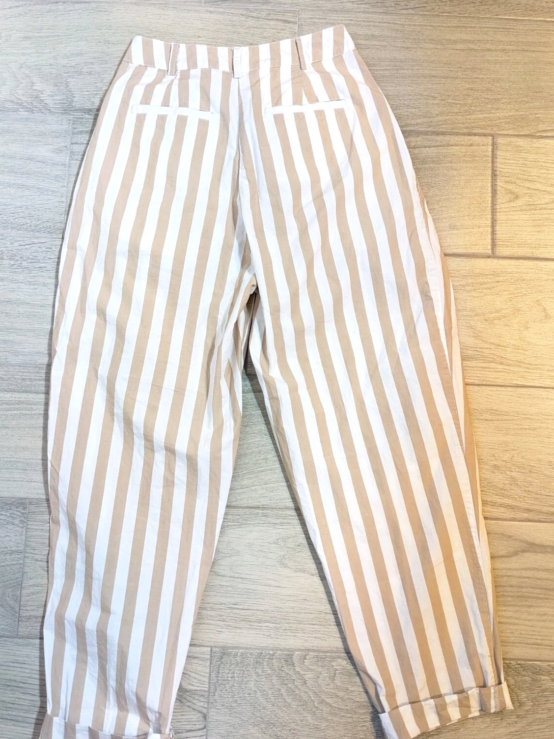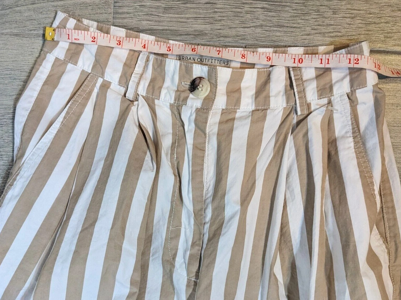 Elevate your casual wardrobe with these Urban Outfitters UO Percy Pleated High Rise Tapered Pants. The beige striped pattern adds a touch of 90s vibe to the relaxed fit. Pleated and button accents, along with the tapered leg style, provide both style and comfort. The cotton material with canvas fabric type ensures durability and breathability. Perfect for any casual occasion, these pants come in size 2 and feature a zip closure. The slimming feature of the pants enhances your figure. With its brand, department, type, and style, these pants are a must-have for any fashion-forward woman.