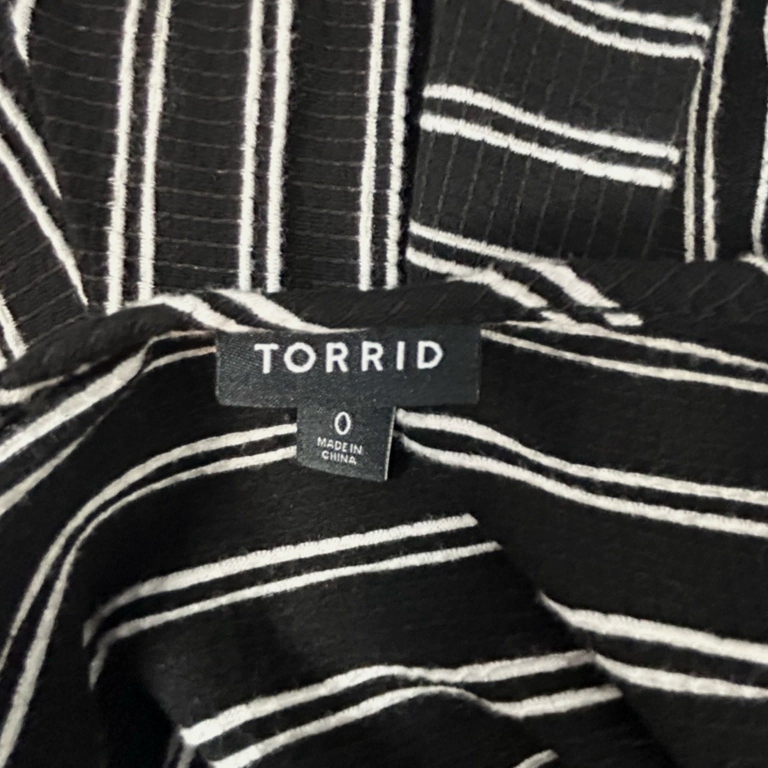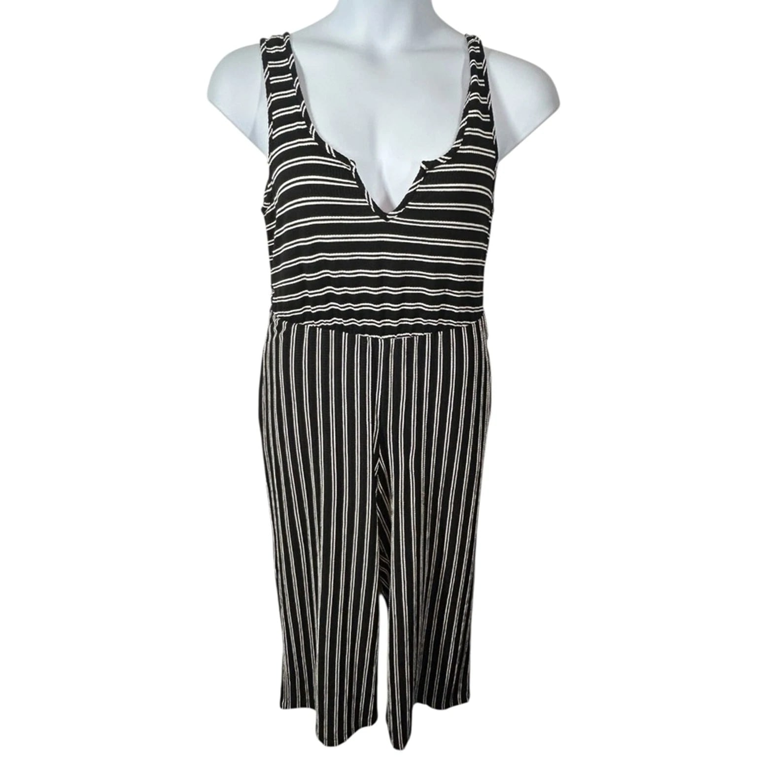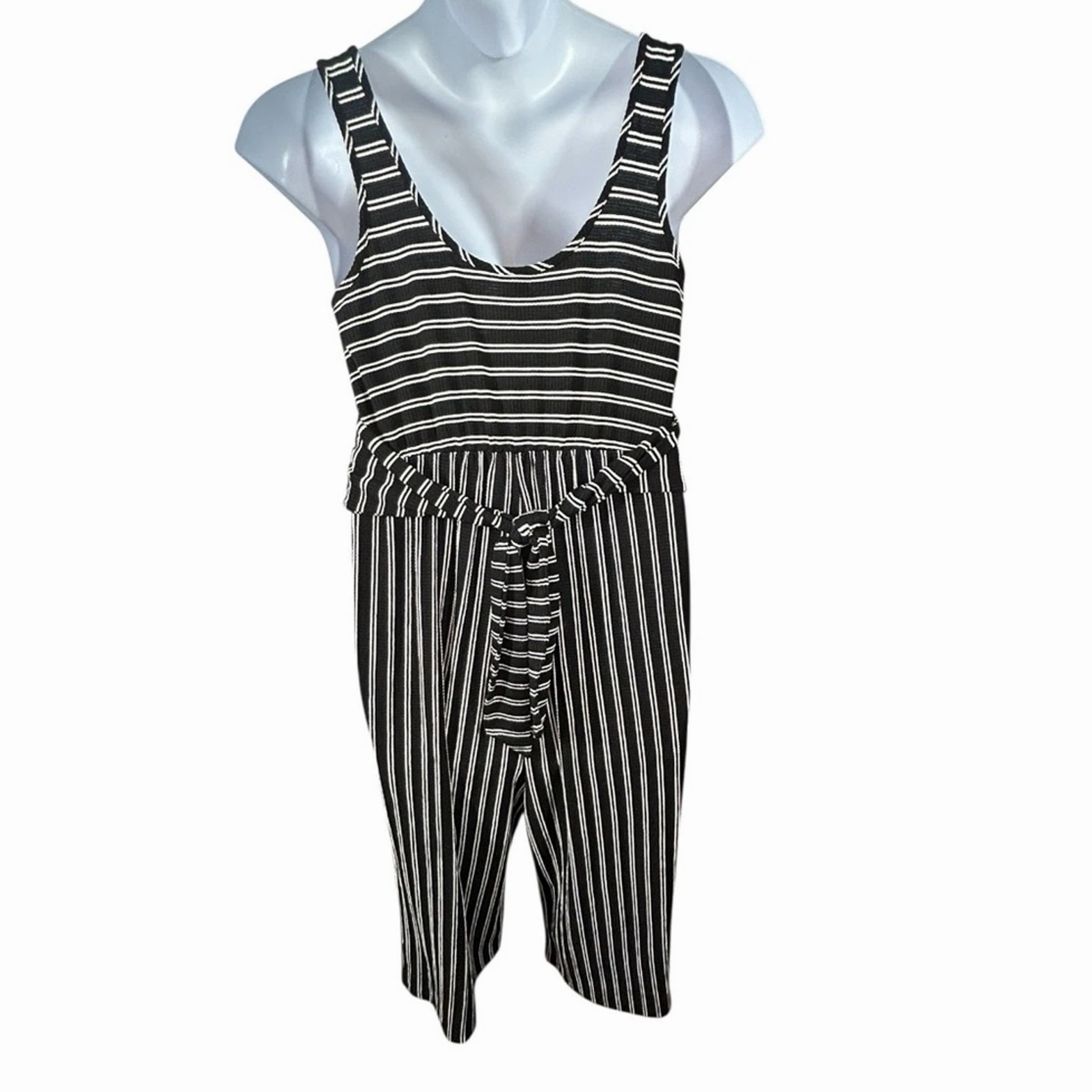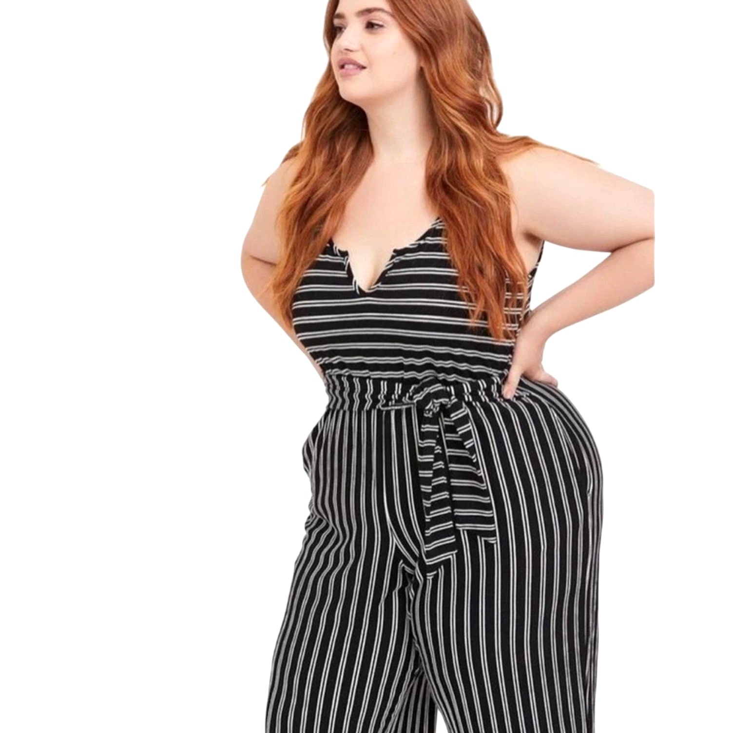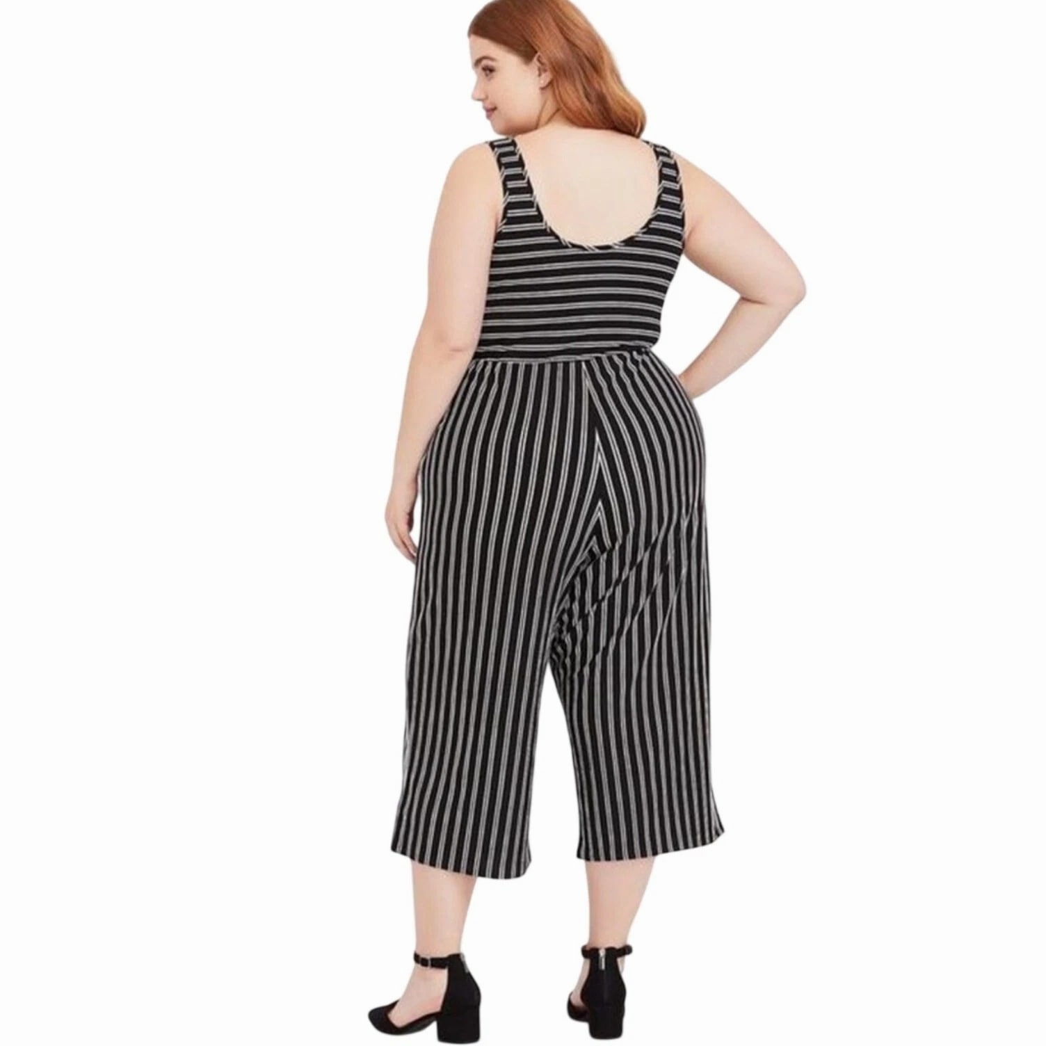 Torrid Women's Striped Culotte Jumpsuit Size 0 Black White Belted Wide Leg Torrid black and white striped culotte jumpsuit in size 0 (Large). Features elastic waist, matching belt, and cropped wide leg design. Comfortable stretch fabric, ideal for casual wear or travel. Measurements (laid flat): Pit to pit: 17 in Waist: 14.5 in (elastic) Length: 48 in Rise: 13.5 in Inseam: 22 in Condition: Excellent preowned Keywords: Torrid jumpsuit, striped jumpsuit women, plus size jumpsuit, casual one piece outfit